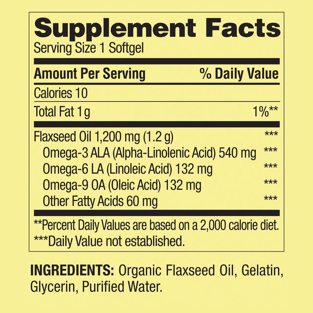 Our Spring Valley Flaxseed Oil Softgels are formulated to support your heart health*. Each softgel delivers 1,200 milligrams of cold-pressed, hexane-free flaxseed oil, a good source of the omega-3 essential fatty acid ALA (Alpha-Linolenic Acid) in addition to the omega-6 essential fatty acid LA (Linoleic Acid) and the omega-9 essential fatty acid OA (Oleic Acid), which may support heart health and may maintain a healthy cardiovascular system.* These polyunsaturated fats found in our flaxseed oil cannot be manufactured by your body and must be obtained through your diet. The suggested adult dosage is one softgel three times daily, preferably with meals as a dietary supplement. You can rest assured knowing that our Spring Valley Flaxseed Oil Softgels are produced with strict quality guidelines and are backed by our quality guarantee.