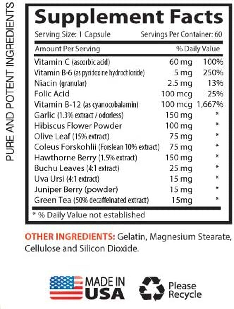 - Blood Pressure Support: This product has a an array of different natural ingredients put together to help support your healthy blood pressure. The ingredients that are included in this natural product are: Vitamin C, Vitamin B6, Niacin, Folic Acid, Vitamin B-12, Garlic, Hibiscus, Olive Leaf, Coleus Forskohlii, Hawthorn Berry, Buchu Leaves, Uva Ursi, Juniper Berry and Green tea.