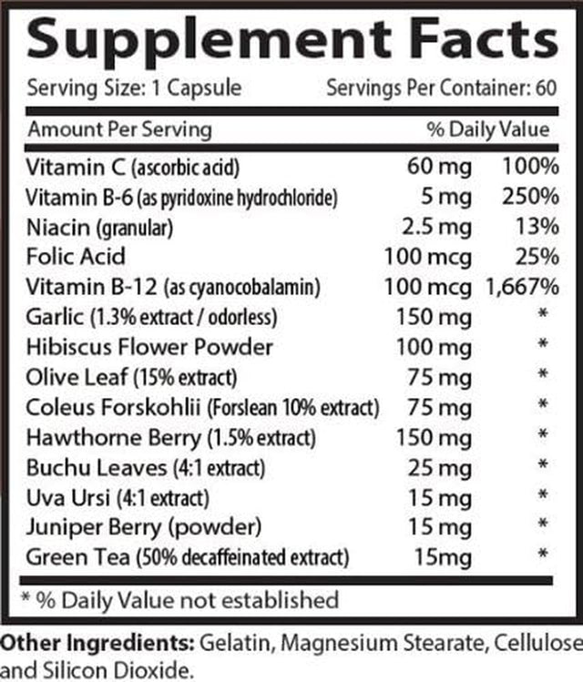- Blood Pressure Support: This product has a an array of different natural ingredients put together to help support your healthy blood pressure. The ingredients that are included in this natural product are: Vitamin C, Vitamin B6, Niacin, Folic Acid, Vitamin B-12, Garlic, Hibiscus, Oliv Leaf, Coleus Forskohlii, Hawthorn Berry, Buchu Leaves, Uva Ursi, Juniper Berry and Green tea.
