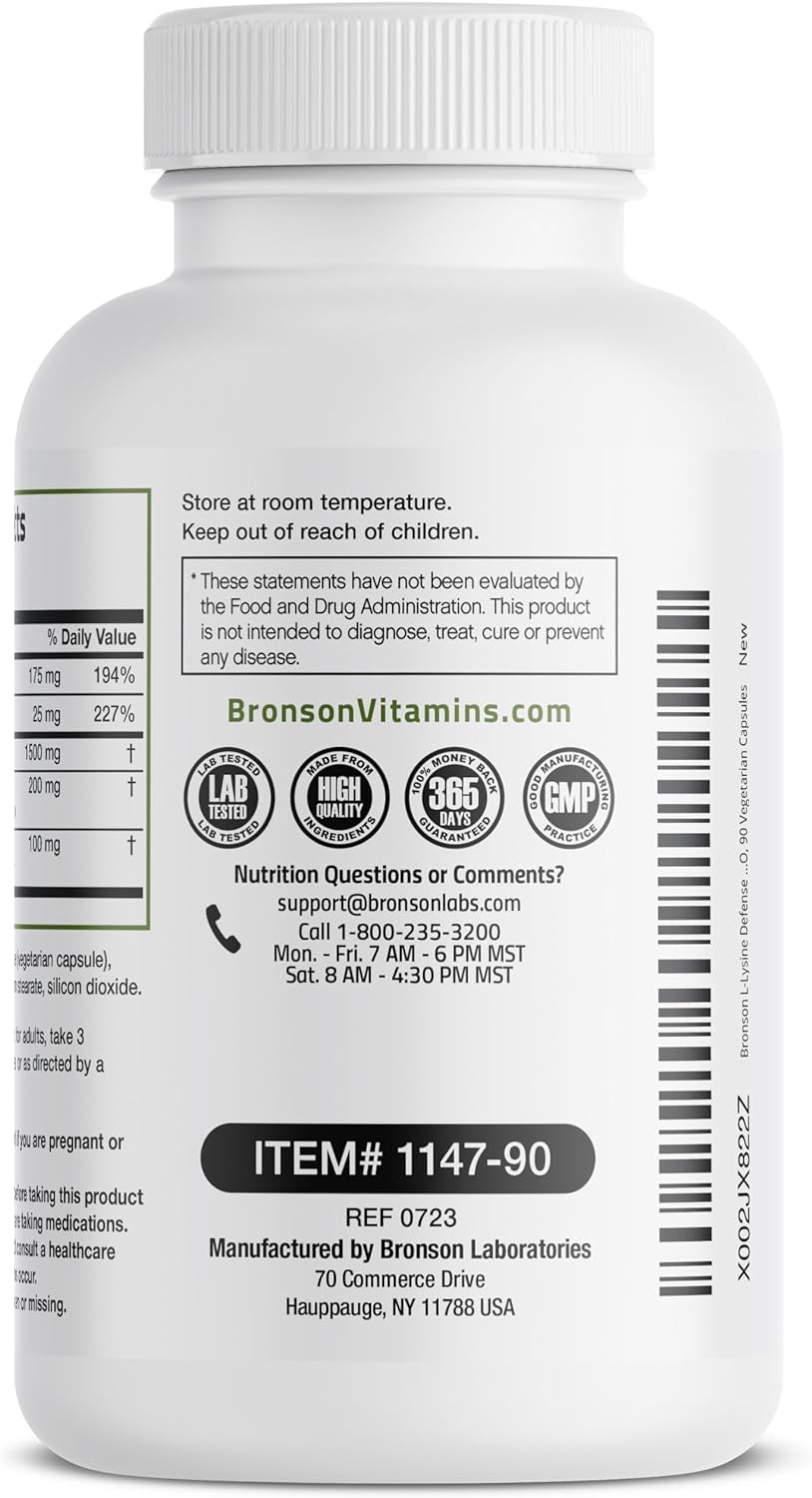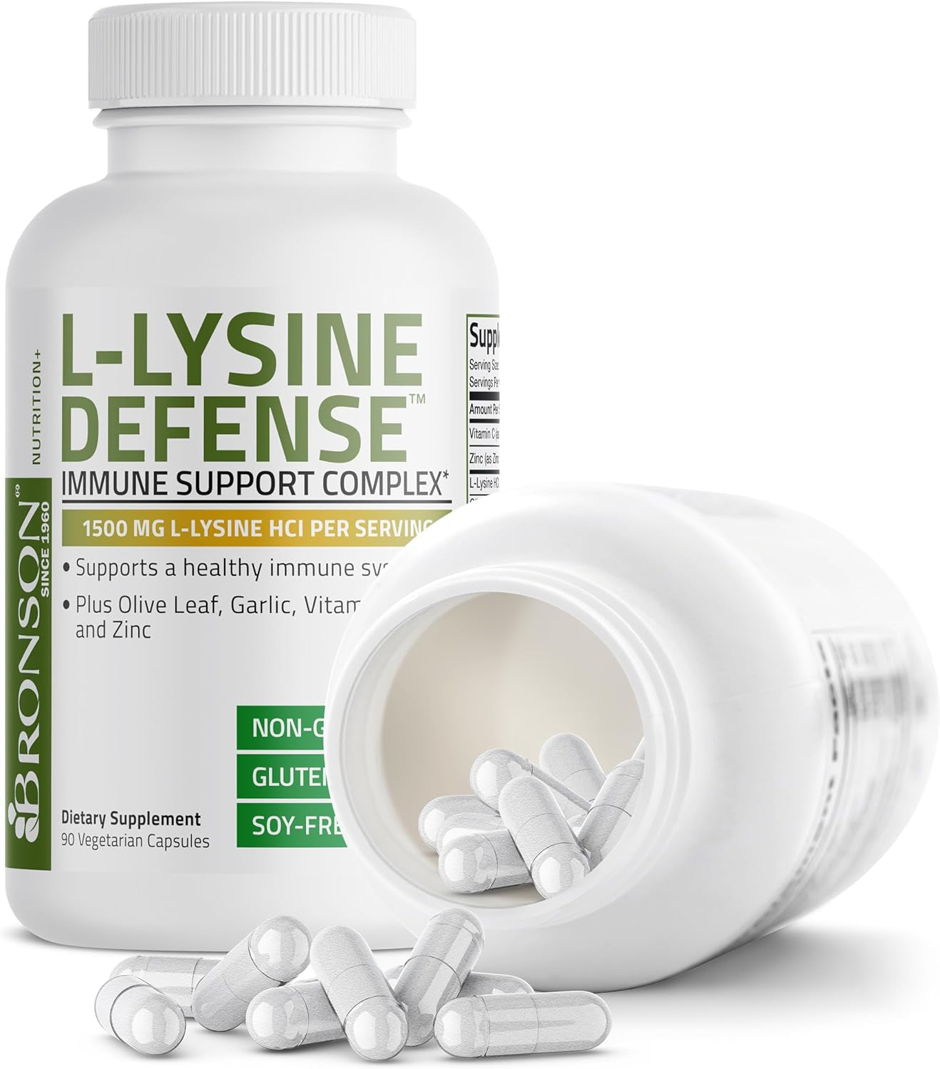 Bronson’s L-Lysine Defense Immune Support Complex provides 1500 mg of L-Lysine plus additional key ingredients to support the immune system.* L-Lysine is an essential amino acid that is obtained through foods and supplementation. It’s thought that L-Lysine helps to maintain normal production of the amino acid L-Arginine. L-Lysine Defense also features natural herbal ingredients Olive Leaf and Garlic, which have been used throughout history in various cultures to support immune health.* Additionally, L-Lysine Defense includes Vitamin C and Zinc to help replenish the body with essential nutrients to help maintain the immune system.* Laboratory tested Non-GMO, Gluten-Free, and Soy-Free, L-Lysine Defense Immune Support Complex is carefully manufactured within our GMP New York Facility.