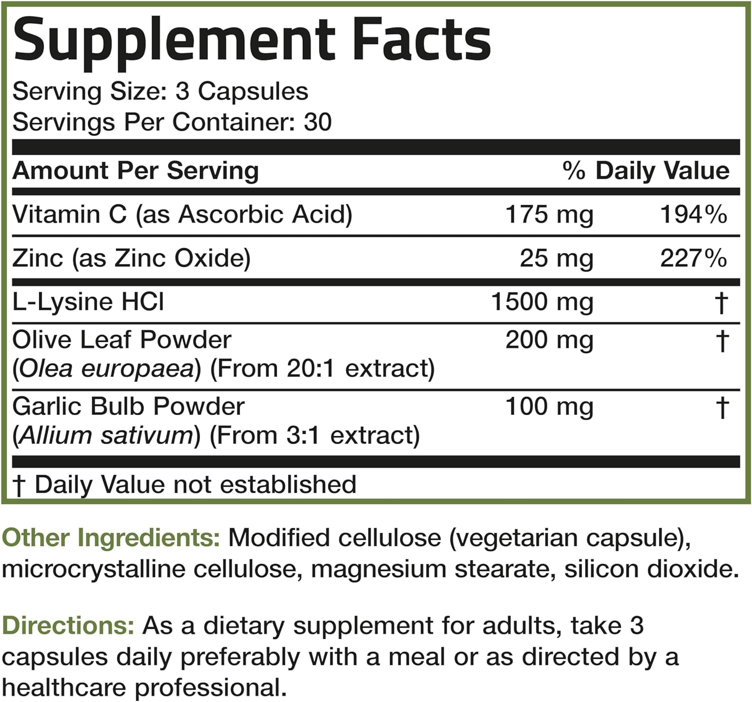 - Plus Olive Leaf, Garlic, Vitamin C & Zinc: L-Lysine combined with key additional immune support ingredients for superior coverage. Combining natural herbal ingredients, such as Olive Leaf and Garlic, which have been used throughout history in various cultures to support immune health.* Additionally includes Vitamin C and Zinc to help replenish the body with essential nutrients to help maintain a healthy immune system.*
