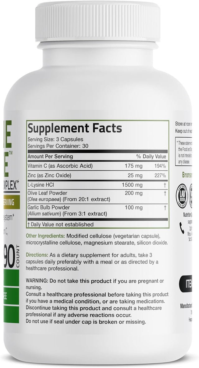 Bronson L-Lysine Defense Immune Support Complex 1500 MG L-Lysine plus Olive Leaf, Garlic, Vitamin C and Zinc - Non-Gmo, 90 Vegetarian Capsules