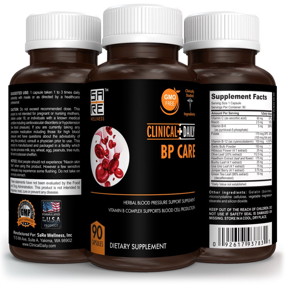 Clinical Daily Blood Pressure Support, BP Optimizer & Heart Health Supplement with Folic Acid, Niacin, Garlic, Uva Ursi, Hawthorne Berry Extract, Buchu, Hibiscus, Vitamins B6 B12 C, 90