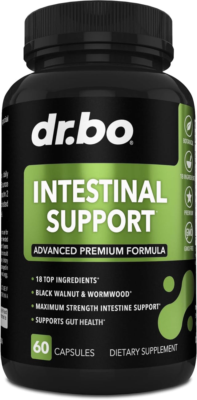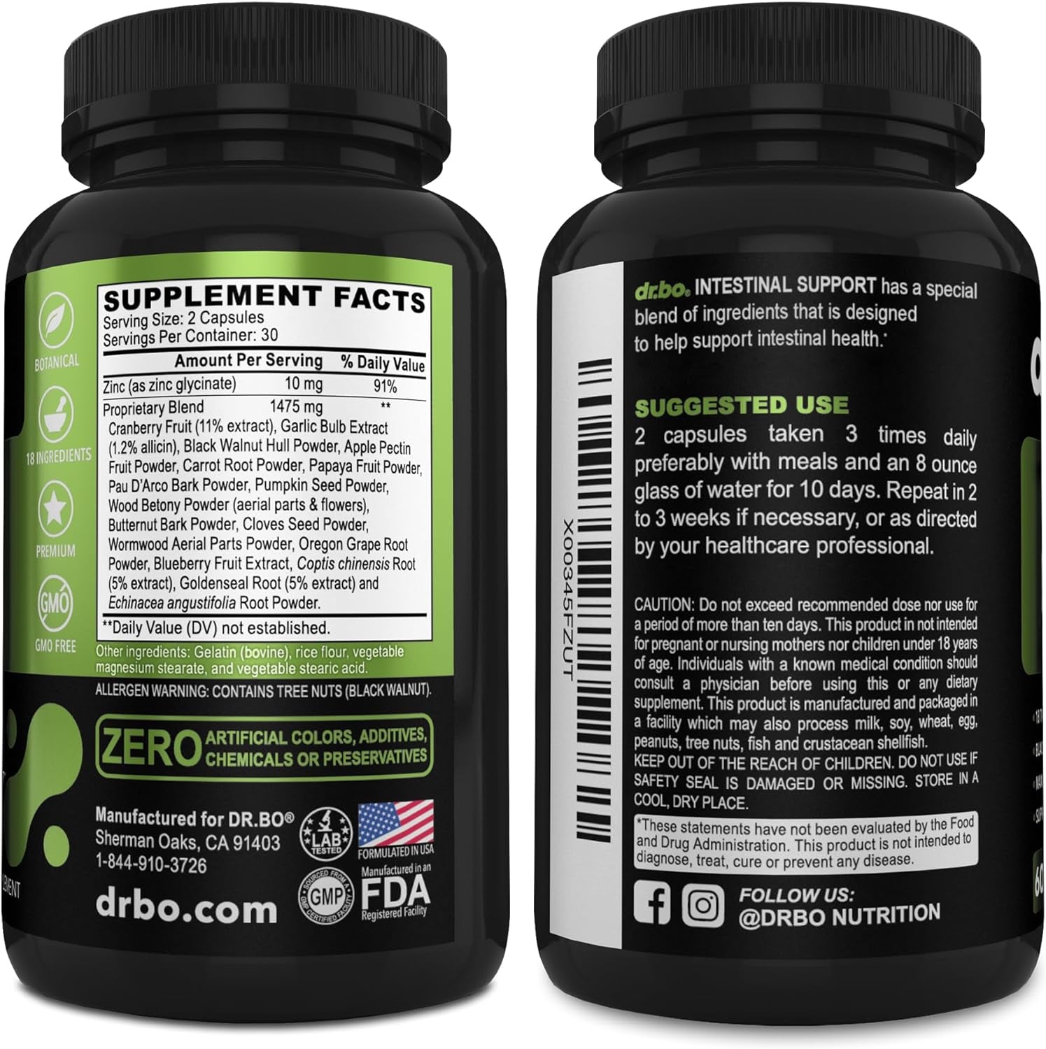 Support gut health with our herbal intestinal formula. Packed with 18 ingredients like zinc, cranberry fruit, garlic extract, black walnut powder, apple pectin, carrot root, papaya fruit, pumpkin seed, wood betony, butternut bark, cloves seed, oregon grape root, blueberry fruit extract, goldenseal, echinacea and more! Support digestive health with this Dr. Bo herbal blend.