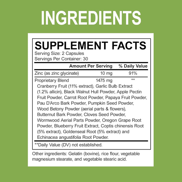 - 18 Ingredients - Zinc, cranberry fruit, garlic extract, black walnut powder, apple pectin, carrot root, papaya fruit, pumpkin seed, blueberry extract, goldenseal, echinacea and more.