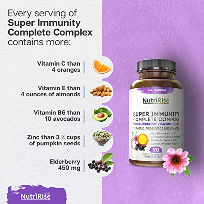 Immunity Complex Immune Support Supplement - 10 Super-Concentrated Ingredients: Vitamin C E B6 Zinc L-Glutamine Elderberry Echinacea Garlic Turmeric Curcumin 7.2 Billion CFU Probiotics For Men & Women