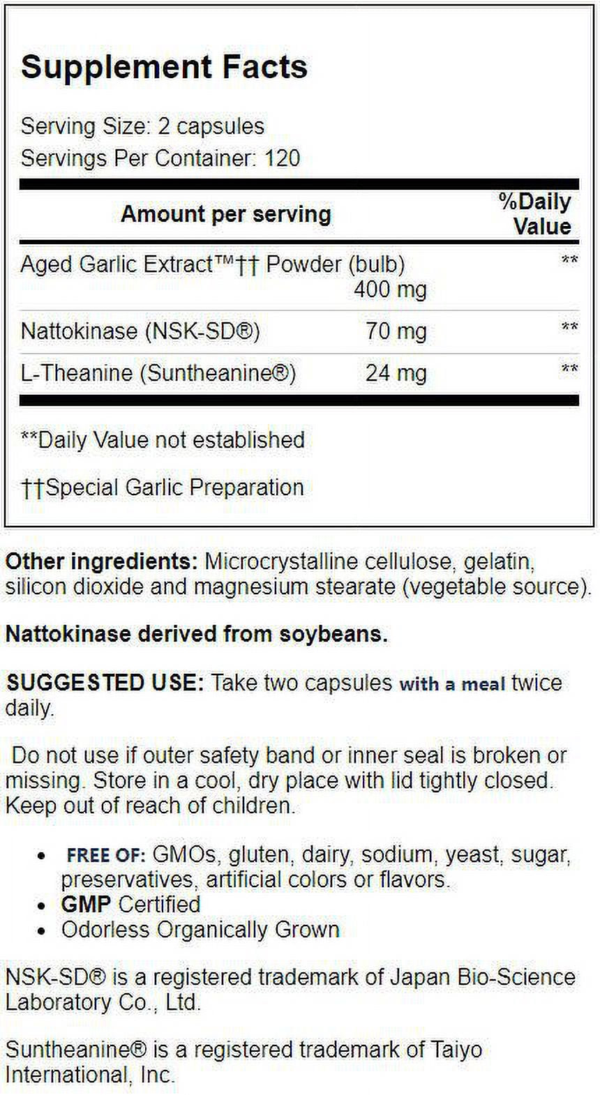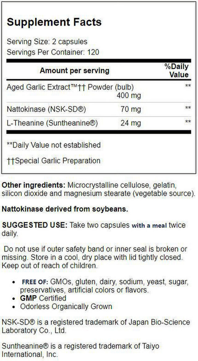 The clinically studied ingredients in Kyolic Blood Pressure Health Formula 109 work to maintain healthy blood pressure levels already within the normal range. Each two-capsule serving delivers 400 mg aged garlic extract, 70 mg NSK-SD(R) nattokinase and 24 mg Suntheanine(R) L-theanine. Nattokinase is derived from the traditional Japanese food natto and has been studied for its potential to support healthy blood flow. Suntheanine is a patented form of the amino acid L-theanine which helps promote a relaxed, but alert, mental state allowing you to have a healthy response to daily stressors.