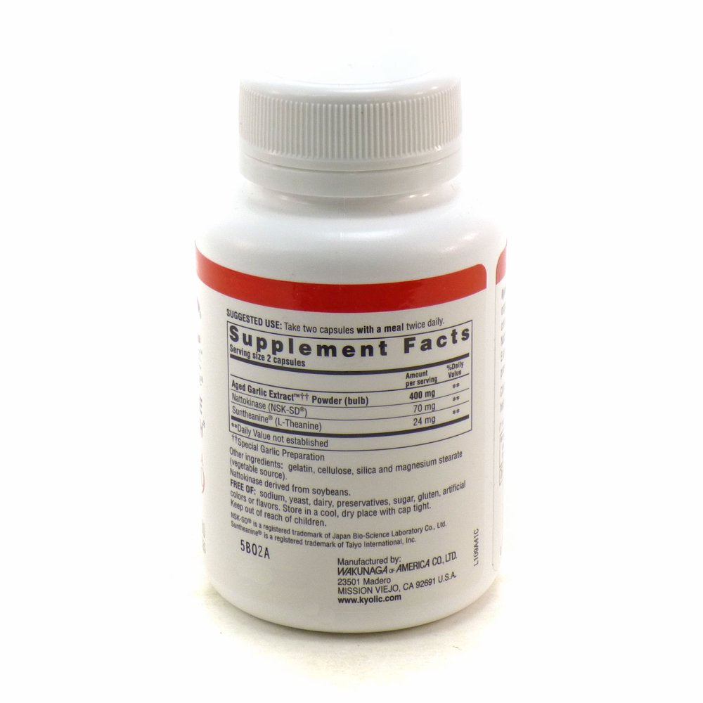 Odorless Organic Garlic Supplement Nattokinase, Suntheanine® GMP Certified Kyolic® Aged Garlic Extract™ begins with 100% organically grown garlic from California. It is then aged to perfection in a unique extraction process to eliminate odor and create beneficial compounds found only in Kyolic. Kyolic® Formula 109 contains a unique and natural combination of Nattokinase and Suntheanine® with Aged Garlic Extract™. Clinical studies have shown these ingredients can help promote relaxation and support healthy blood pressure levels, already within normal ranges.
