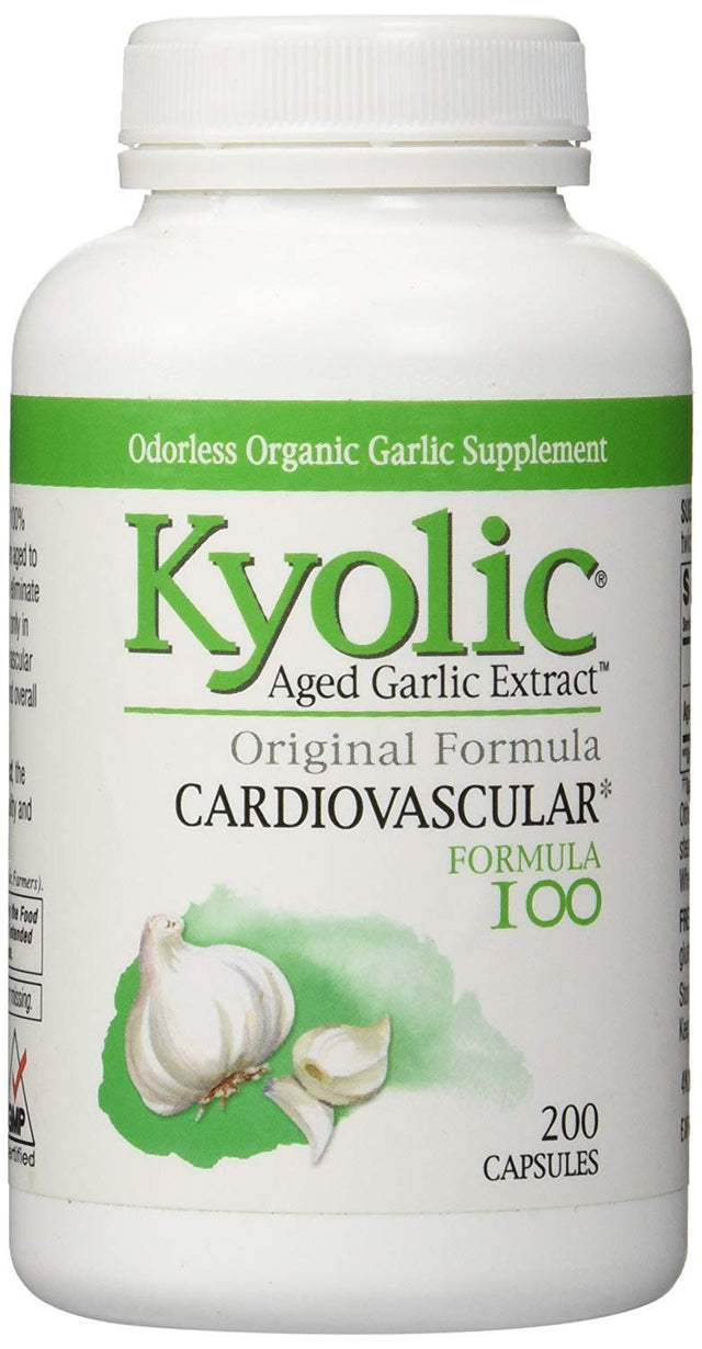 Kyolic Aged Garlic Extract Cardiovascular Formula 100 Description: Original Formula. Cardiovascular Health, Cholesterol Levels. Immune Function, Liver Function and Nerves. Odorless Organic Garlic Supplement Kyolic Aged Garlic Extract begins with 100% organically grown garlic bulbs. They are then aged to perfection in a unique extraction process to eliminate odor and create beneficial compounds found only in Kyolic. This formula supports your cardiovascular system by maintaining circulatory function and overall heart health. Take the best - Kyolic Aged Garlic Extract, the most scientifically researched, highest quality and best-selling odorless Sociable Garlic Free Of Yeast, sodium. Disclaimer These statements have not been evaluated by the FDA. These products are not intended to diagnose, treat, cure, or prevent any disease.