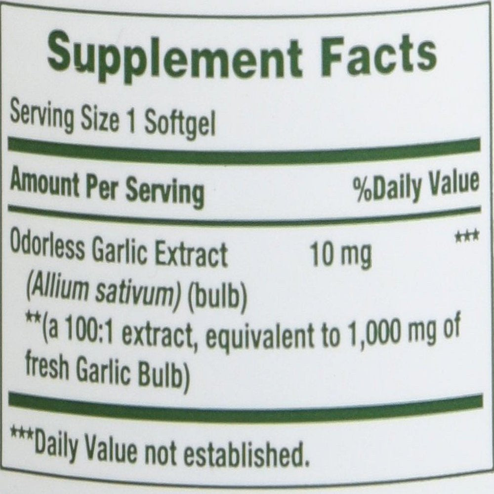 - Pack of 2 for the UPC: 074312123269 The company for all your vitamin and nutritional needs. Active Ingredients: 1 Softgel: Odorless Garlic 1000 mg (1 g) (Allium Sativum) (Bulb) (From 10 mg Garlic Oil Concentrate) (Equivalent to 1000 mg of Fresh Garlic Bulb); Soybean Oil; Gelatin; Vegetable Glycerin; Silica Uses: Garlic promotes heart and cardiovascular health and helps maintain cholesterol levels that are already within the normal range.* Garlic also contains beneficial antioxidant properties.* Our specialized cold processing method preserves the natural goodness while reducing the odor. No artificial color, flavor, sweetener, no preservatives, no sugar, no starch, no milk, no lactose, no gluten, no wheat, no yeast, no fish. Sodium free. *These statements have not been evaluated by the Food and Drug Administration. This product is not intended to diagnose, treat, cure or prevent any disease.