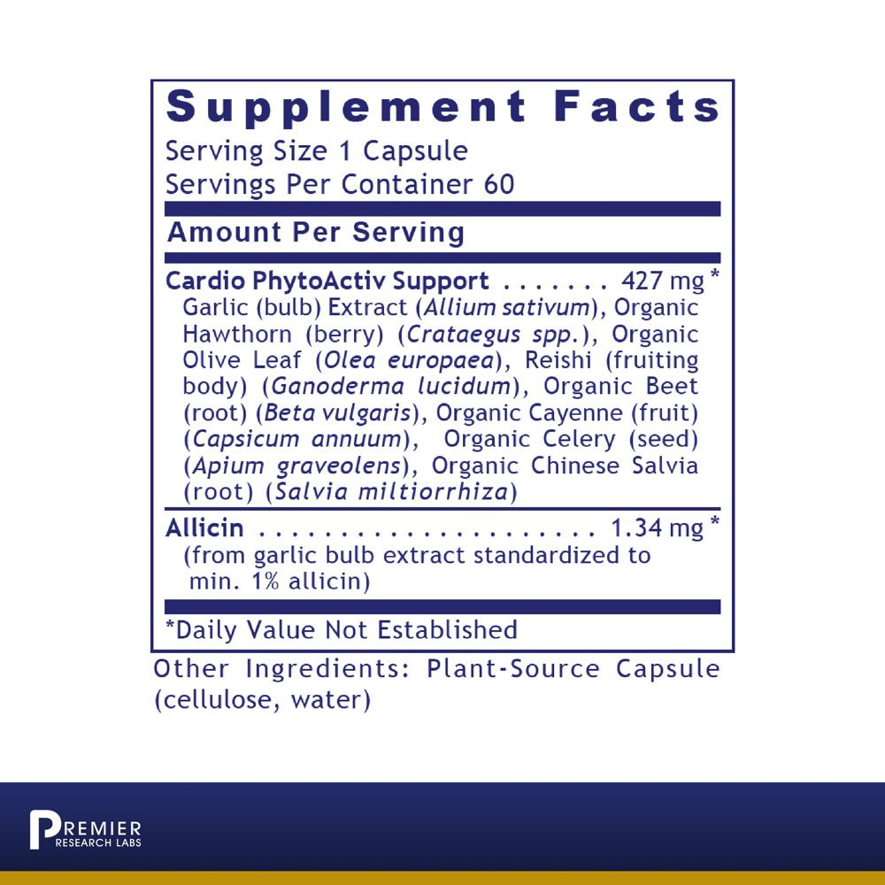 Cardio PhytoActiv Support 427 mg, Garlic (bulb) Extract (Allium sativum), Organic Hawthorn (berry) (Crataegus spp.) , Organic Olive Leaf (Olea europaea), Reishi (fruiting body) (Ganoderma lucidum), Organic Beet (root) (Beta vulgaris), Organic Cayenne (fruit) (Capsicum annuum), Organic Celery (seed) (Apium graveolens), Organic Chinese Salvia (root) (Salvia miltiorrhiza), Allicin 1.34 mg (from garlic bulb extract standardized to min 1% allicin)/div>
