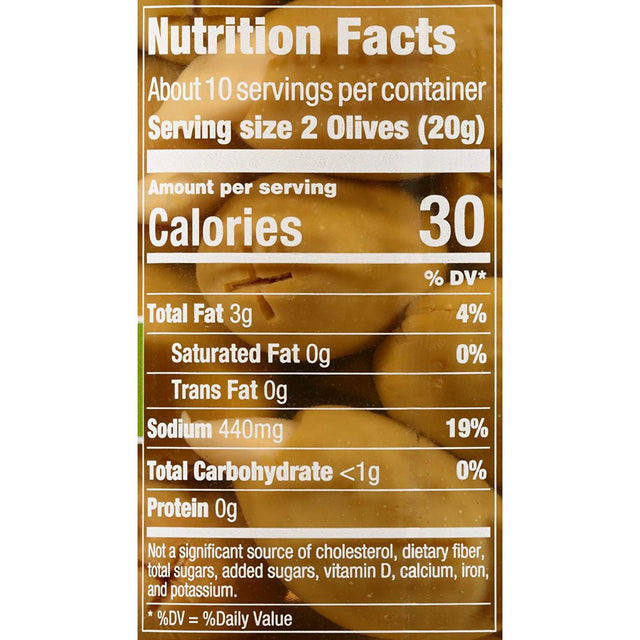 Olives, water, garlic, salt, lactic acid, ascorbic acid, calcium chloride, potassium meta-bisulfate, garlic juice concentrate.Allergens and Diet (Case GTIN: 10072999258035)