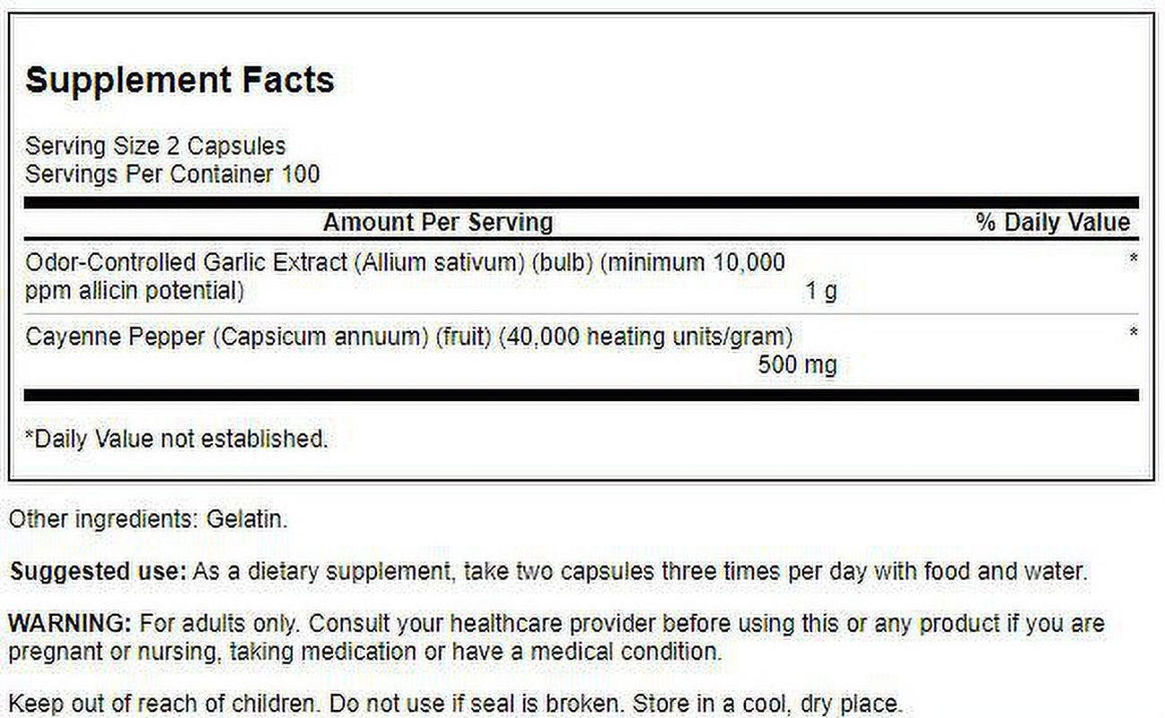 Odor-Controlled Garlic 1 gram *,Cayenne Pepper 500 mg *,Other ingredients: Gelatin, magnesium stearate, silica.,As a dietary supplement, take two capsules three times per day with food and water./div>