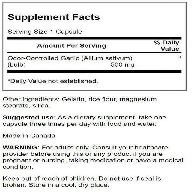 Swanson Odor-Controlled Garlic is an effective way to get the benefits of garlic without the negative odor that comes along with many garlic supplements. Each capsule delivers 500 mg of garlic to benefit cardiovascular health without the lingering smell on your breath. The allicin in garlic may also support the immune system by producing more natural killer (NK) cells in the blood.