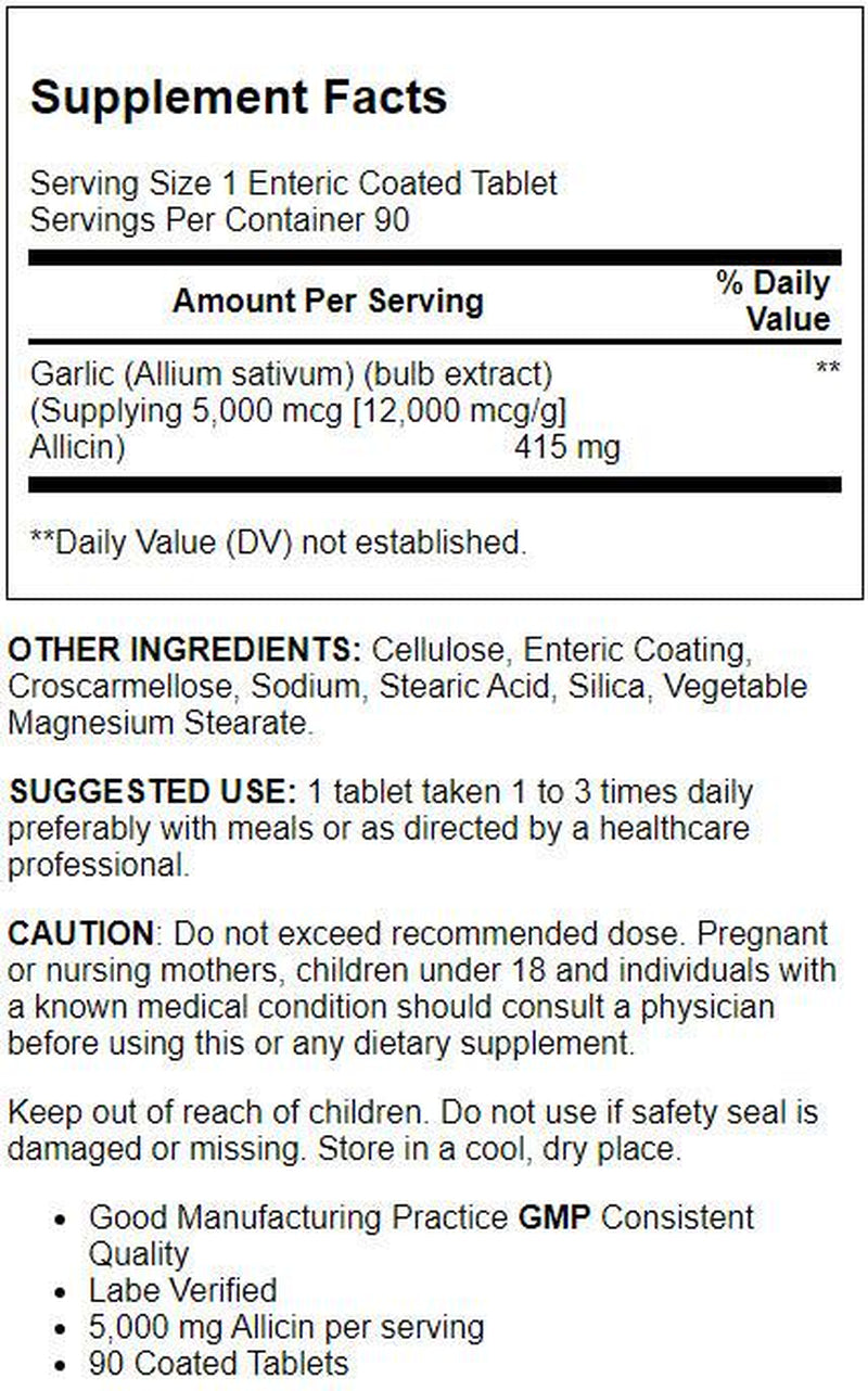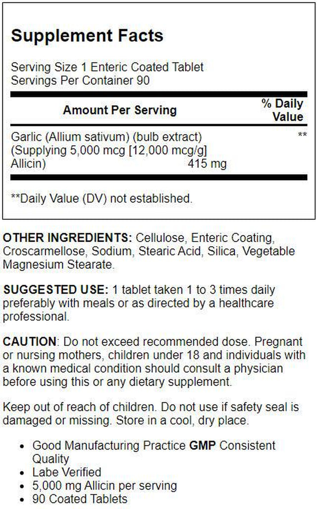 Garlic (Allium sativum) (bulb extract) (Supplying 5,000 mcg [12,000 mcg/g] Allicin), Other Ingredients: Cellulose, Enteric Coating, Croscarmellose Sodium, Stearic Acid, Silica, Vegetable Magnesium Stearate/div>
