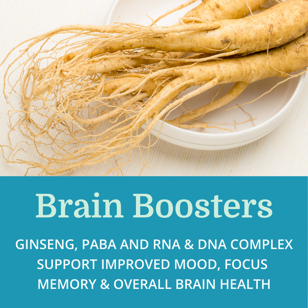 • Boosts Energy & Sharpens Focus — Ginseng, RNA & DNA Complex and PABA naturally elevate energy levels, and enhance focus & mental clarity.