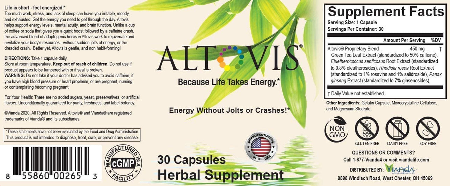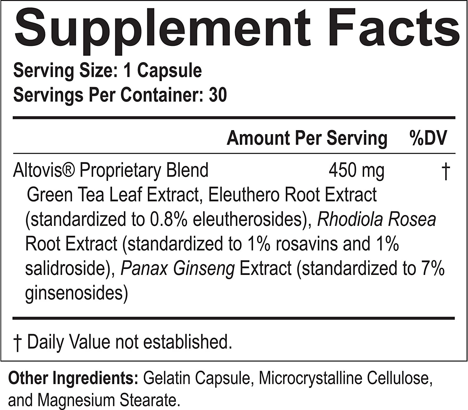 - Altovis provides nutrients to the body to help the body maintain optimal energy levels for protection against occasional mental and physical fatigue. Altovis contains a carefully balanced blend of natural stimulants and adaptogenic agents, including Green Tea Leaf Extract, Eleuthero Root Extract, Rhodiola Rosea Root Extract, and Panax Ginseng Extract. Altovis is Non-GMO, Soy Free, Gluten Free, and Dairy Free.