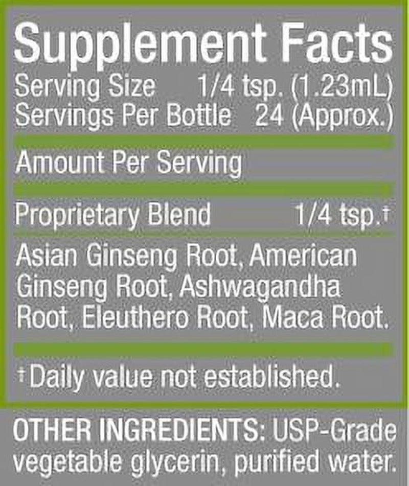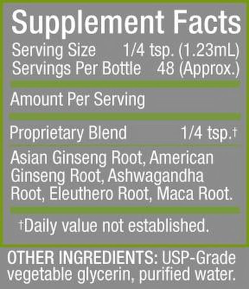 Asian Ginseng Root, American Ginseng Root, Ashwagandha Root, Eleuthero Root, Maca Root USP Grade Vegetable Glycerin and Purified Water/div>