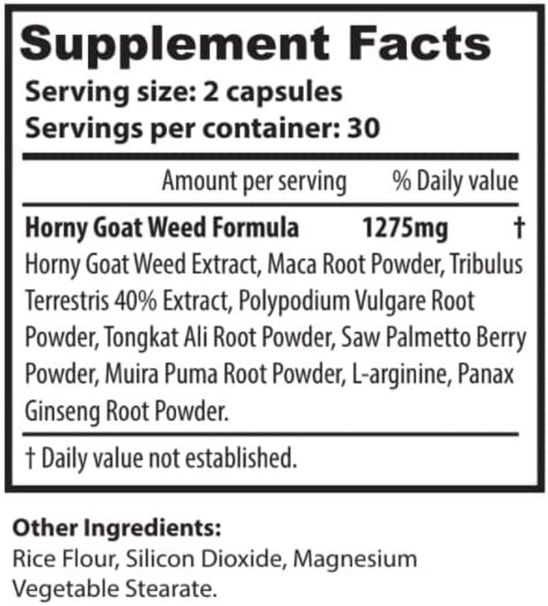 | Product Name | Horny Goat Weed for Men - Male Enhancing Supplement Erection Pills Stamina, Libido Booster Maca Root, Tribulus Terrestris, L-arginine, Saw Palmetto, Ginseng, Tongkat Ali Potent Formula |