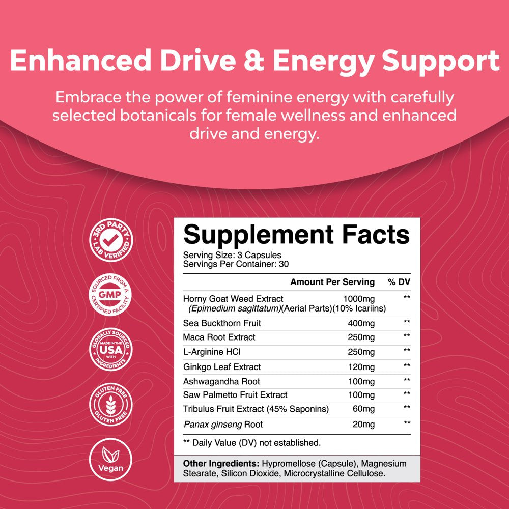 Horny Goat Weed for Women Complex - Invigorating Female Enhancing Blend with Ashwagandha Panax Ginseng and Maca Root Capsules for Women for Increased Drive Energy and Mood and Decreased Dryness