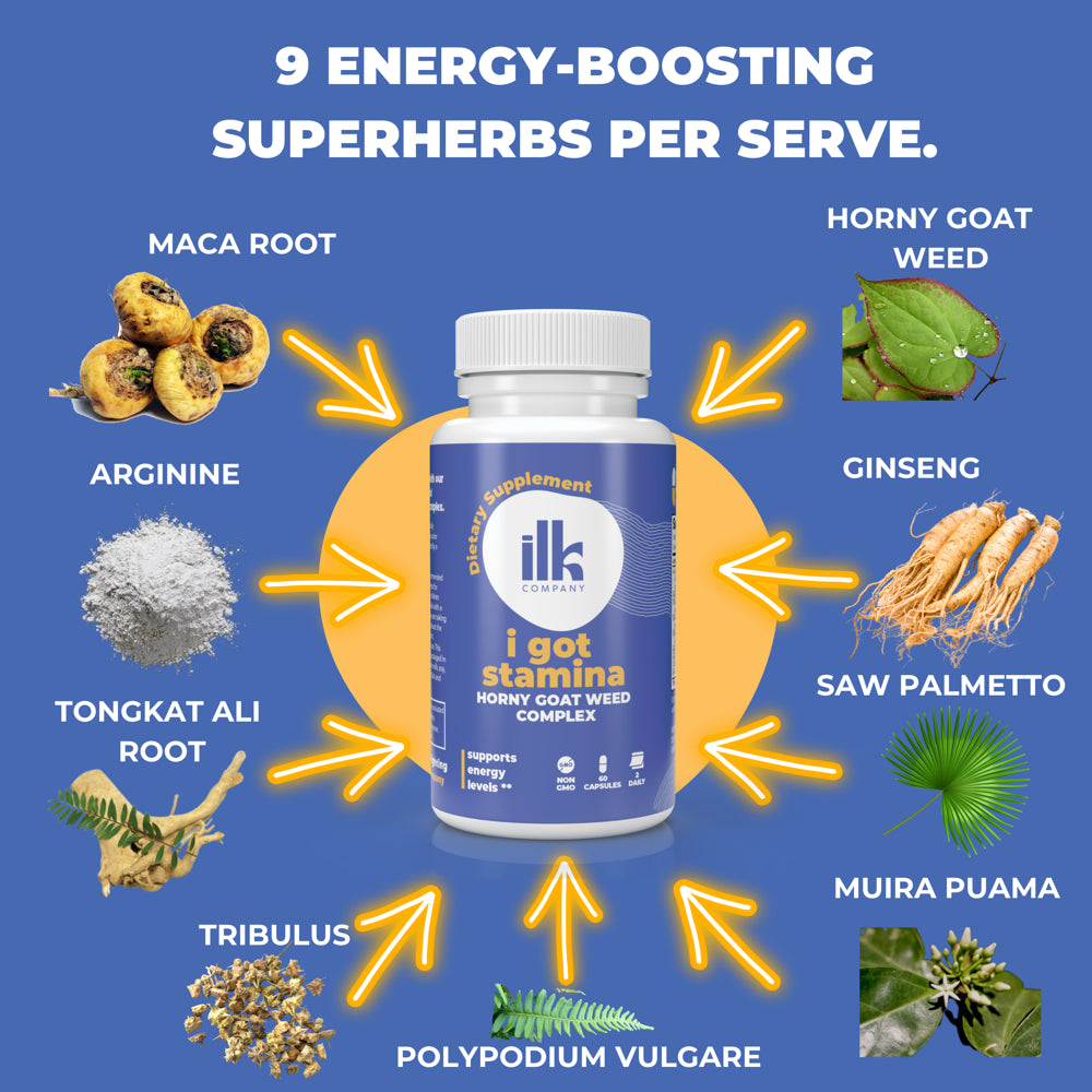 ILK Company - Horny Goat Weed with Maca Root Supplements - Including Tongkat Ali Root, Ginseng, Saw Palmetto Berry, L Arginine & Tribulus - Performance & Energy Support - 60 Capsules