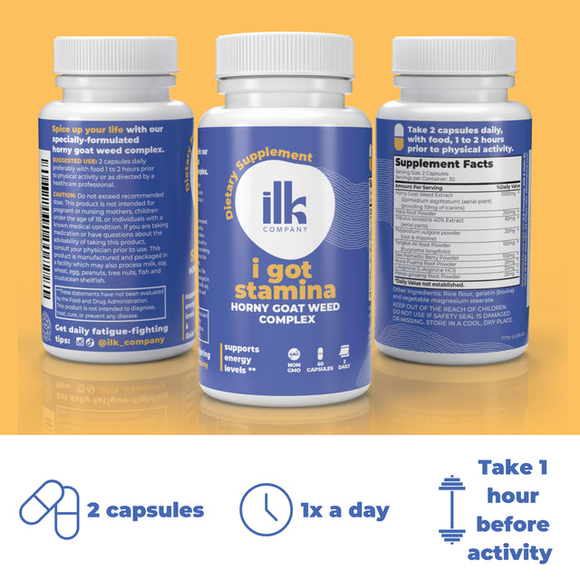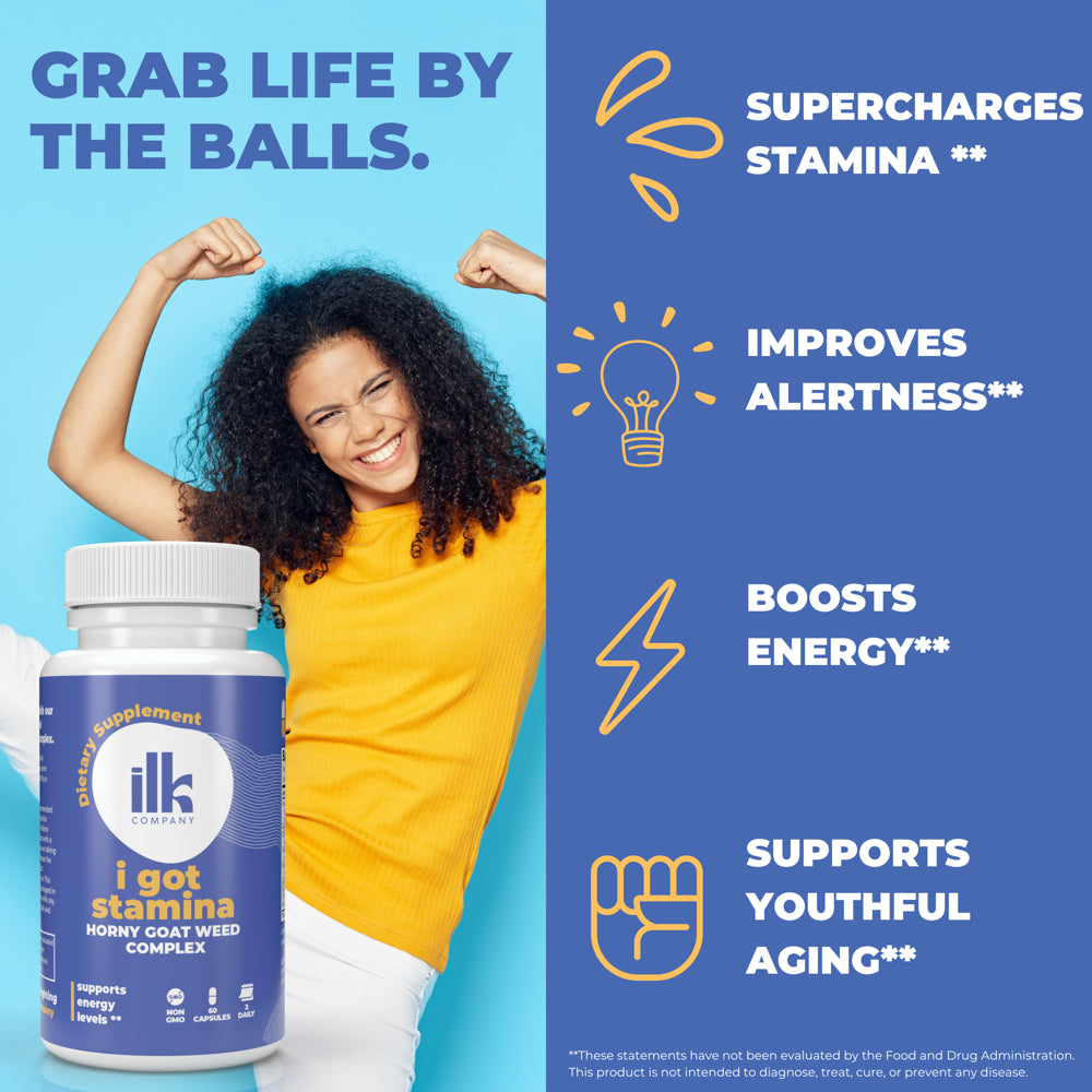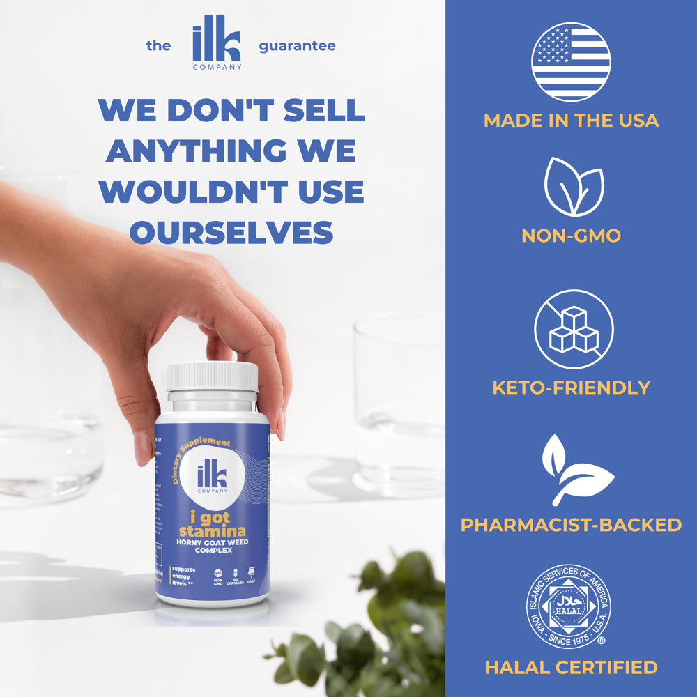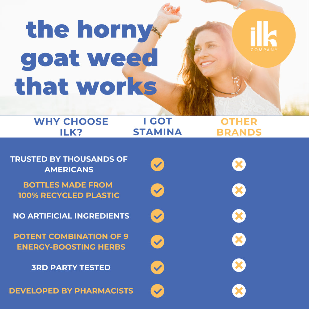 Introducing ILK Company's premium Horny Goat Weed supplement! This all-natural formula, packed with 1000mg per serving, optimizes your vitality and supports healthy bodily functions. Along with Maca root and other powerful herbs, it helps enhance your energy levels, uplift mood, and promote balanced hormone health. This dynamic blend is also designed to support healthy blood circulation, contributing to overall wellness. Our capsules are made with non-GMO ingredients and are vegan-friendly, ensuring a healthy fit for diverse diets. Feel the radiating positivity and boost your physical potential with our Horny Goat Weed supplement – an elixir of vigor and vitality, tailored to your wellness needs.