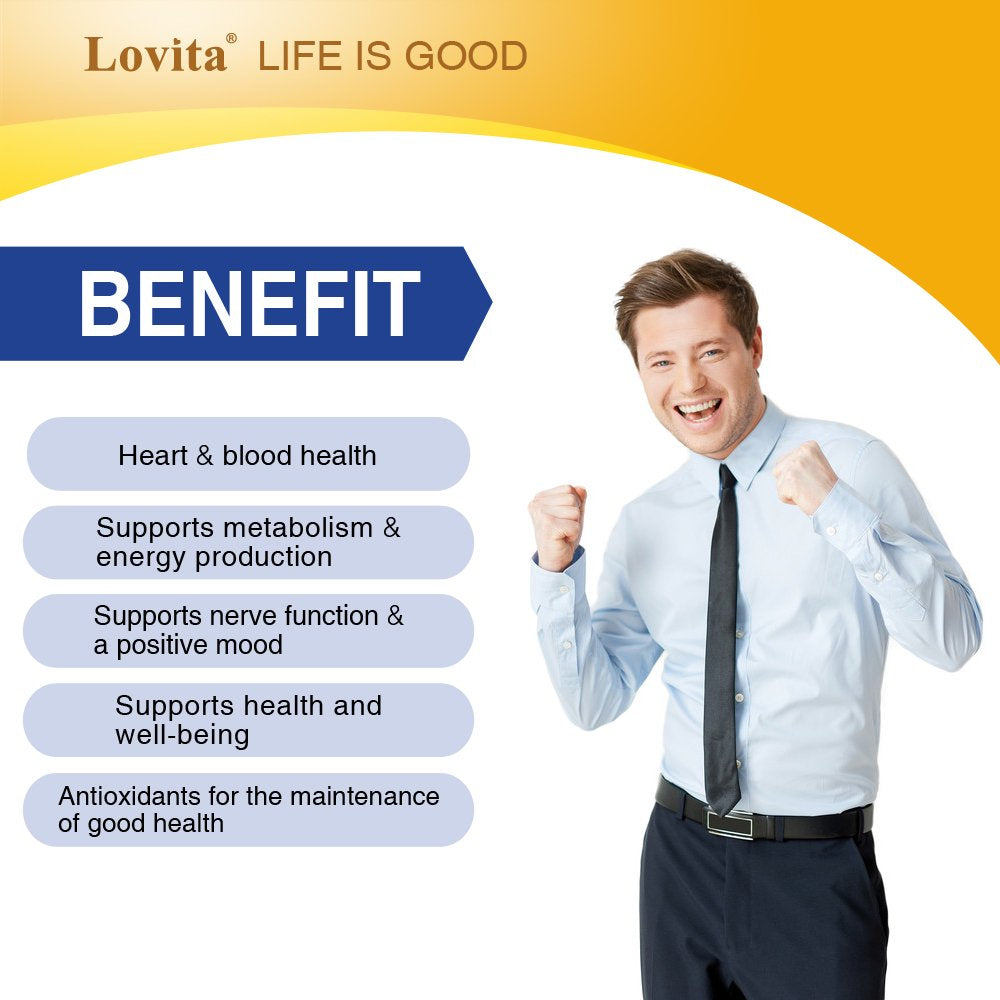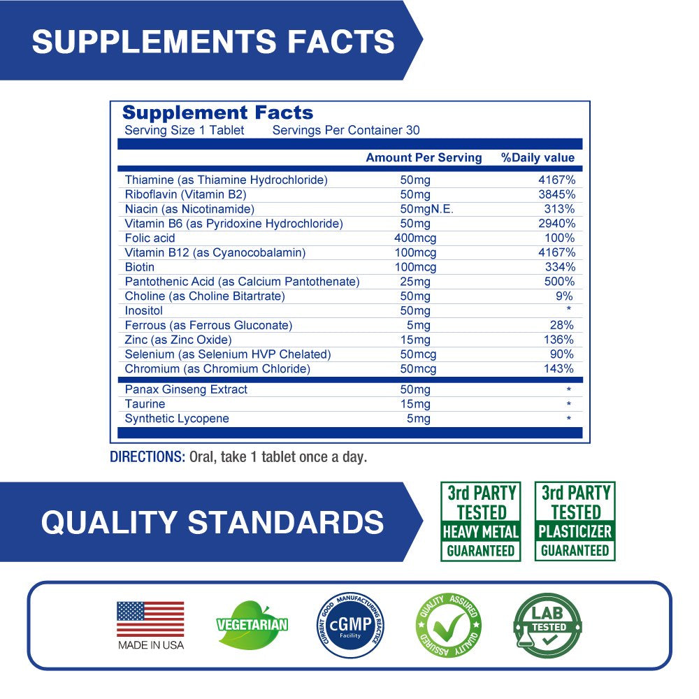 DESIGNED FOR MEN: This advanced formula provides recommended daily allowance (RDA) of several key vitamins and minerals which are specially designed with men’s health in mind. Supplement your diet with Lovita Vitamin B Complex for Men. MORE POTENT VITAMIN B COMPLEX: Our extra strength formula contains all the essential B Vitamins in JUST ONE TABLETS. If you'd rather take your B Vitamins (like B 12 & 6) together in one convenient tablet, look no further! Lovita offers one of the most potent B Vitamin Complex formulas available. TIMED RELEASE + ENERGY: Sustained release over 6-8 hours to provide a steady balanced stream of B vitamins. Maintain healthy energy levels throughout the day. VITALITY, PROSTATE & IMMUNE SUPPLEMENT: This Men’s B Vitamin Complex contains zinc, selenium, ginseng, lycopene and taurine to keep men healthy in daily life. CONTAINS ALL 10 B VITAMINS: B1, B2, niacin (B3), B6, Folic acid, B12, Biotin, Pantothenic acid with inositol and choline.