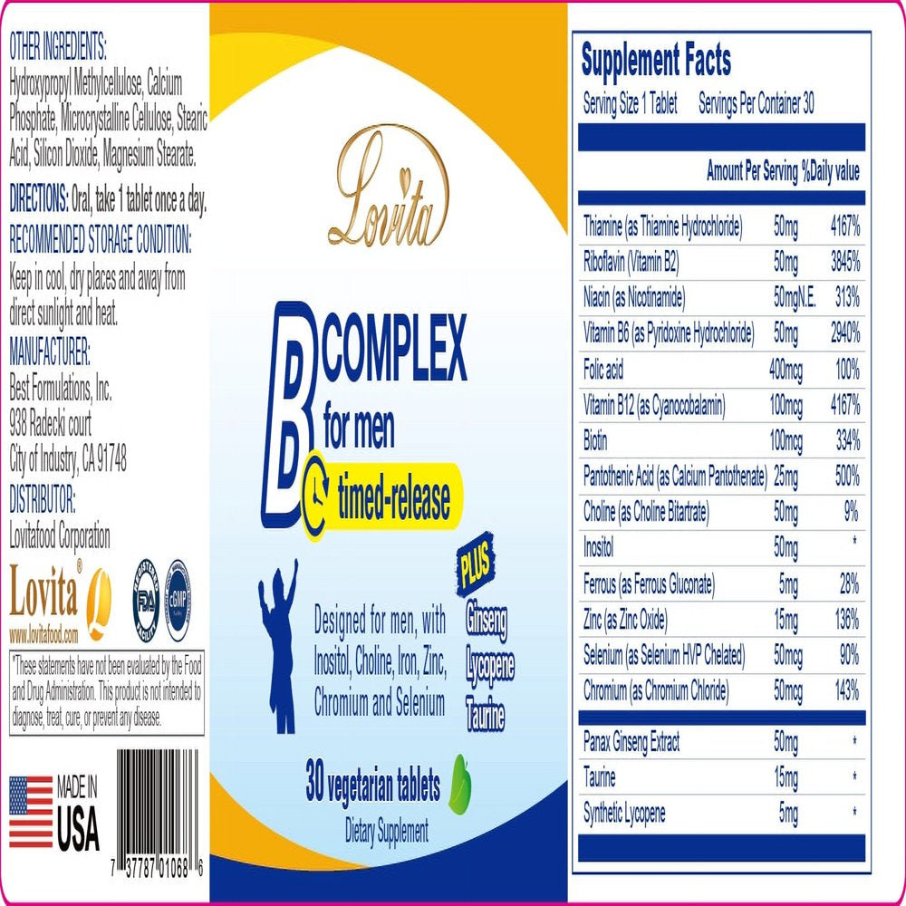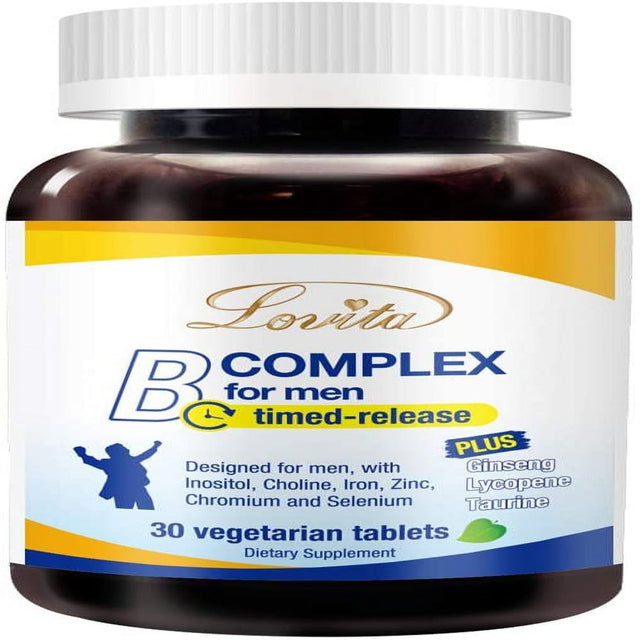 Lovita High Potent Vitamin B Complex for Men, Time Release, Premium Formula with Ginseng Extract, Lycopene, Taurine for Stress, Energy and Prostate Health, 30 Vegetarian Tablets