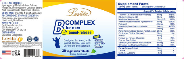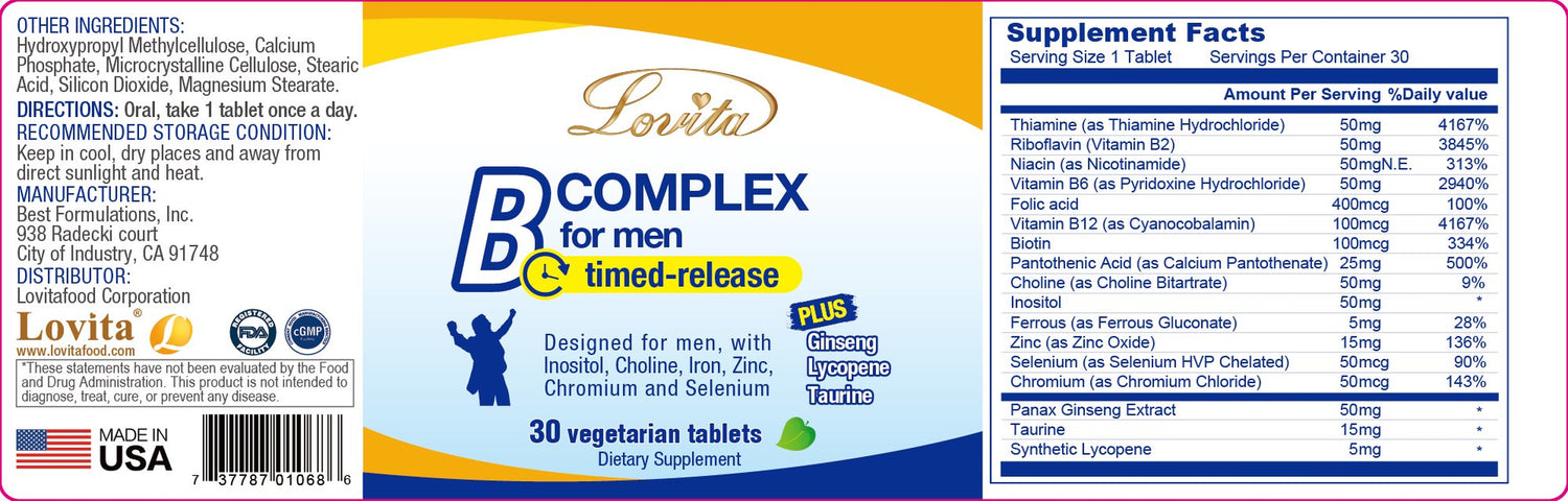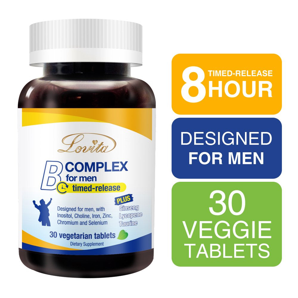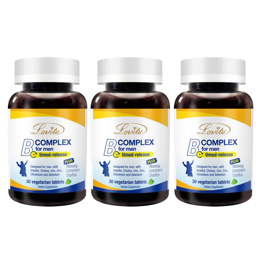 Lovita High Potent Vitamin B Complex for Men, Time Release, Premium Formula with Ginseng Extract, Lycopene, Taurine for Stress, Energy and Prostate Health, 30 Vegetarian Tablets (Pack of 3) - 3 is backordered and will ship as soon as it is back in stock.