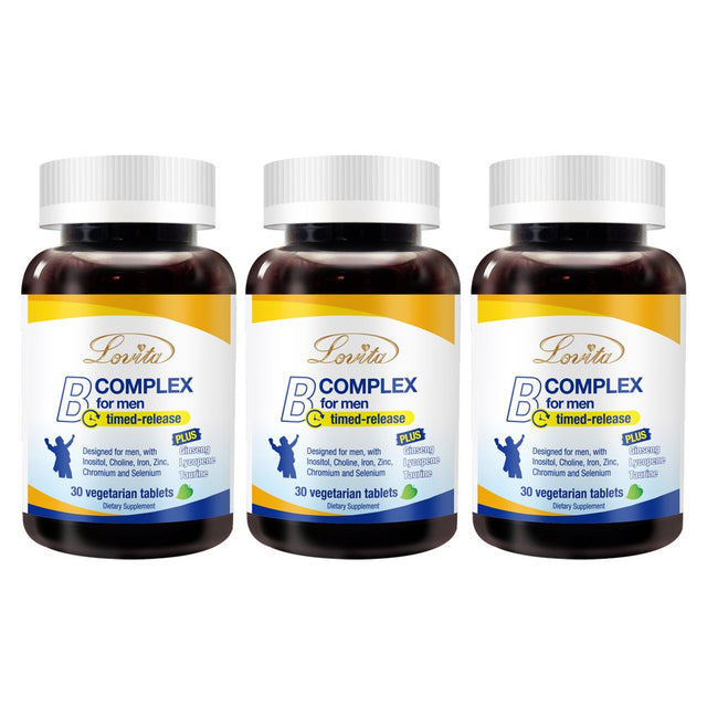 Lovita High Potent Vitamin B Complex for Men, Time Release, Premium Formula with Ginseng Extract, Lycopene, Taurine for Stress, Energy and Prostate Health, 30 Vegetarian Tablets (Pack of 3)
