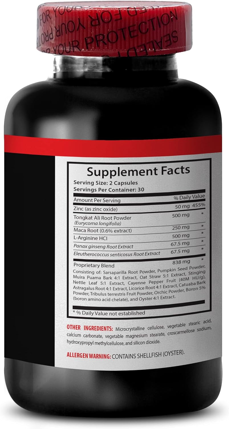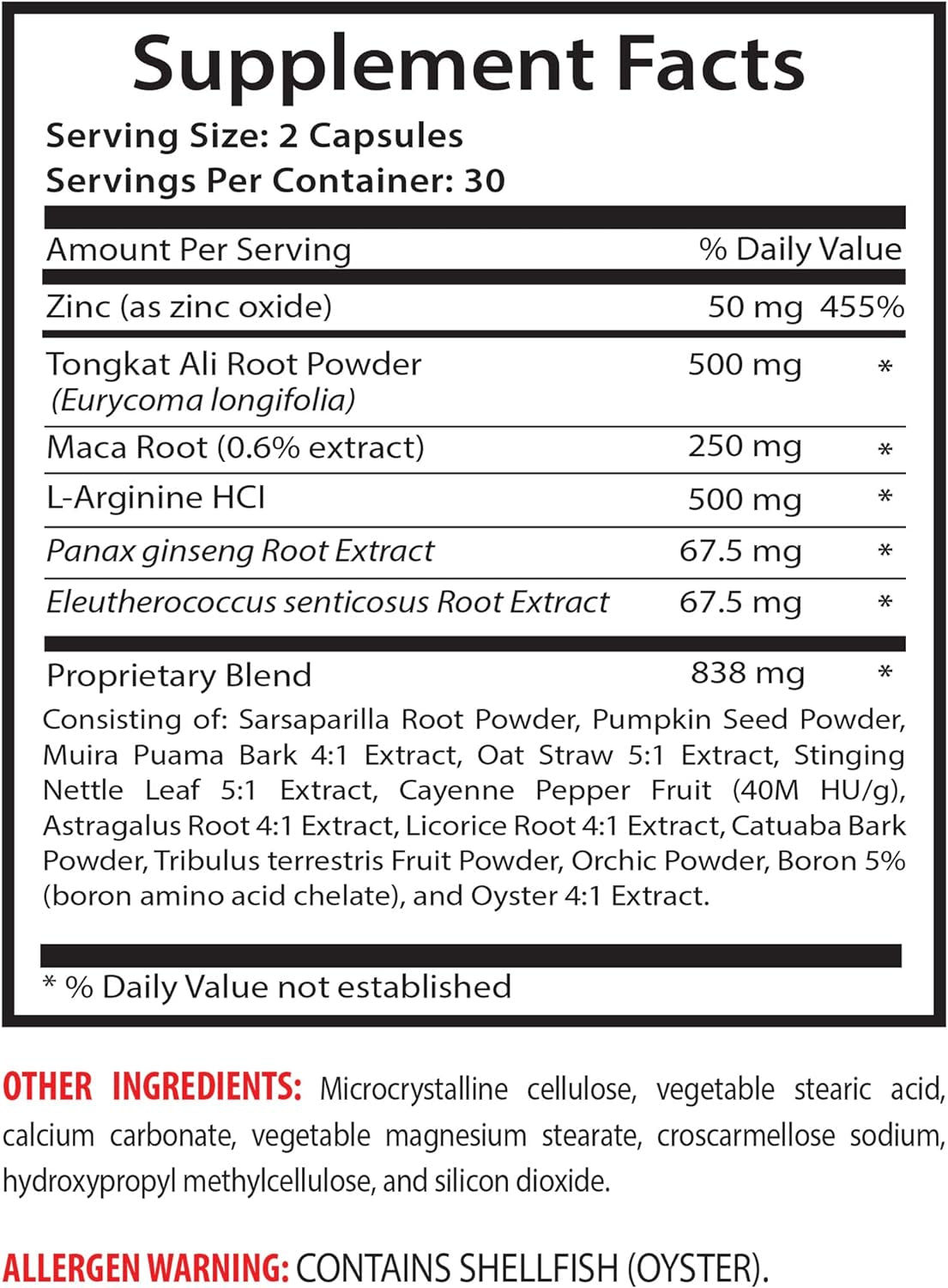 King SIZE - NATURAL T-BOOSTER: Includes a powerful blend of natural PREMIUM HERBS like: Tongkat Ali, Maca, Tribulus Terrestris, L-Arginine, Ginseng Blend (Korean/Siberian), Sarsaparilla, Pumpkin powder, Muira Puama, Oat Straw, Nettle, Cayenne Pepper, Astragalus, Catuaba Bark, Orchic Oyster extract, Baron. It was designed to boost T levels in men, increase energy, improve performance and health, increase drive and desire.