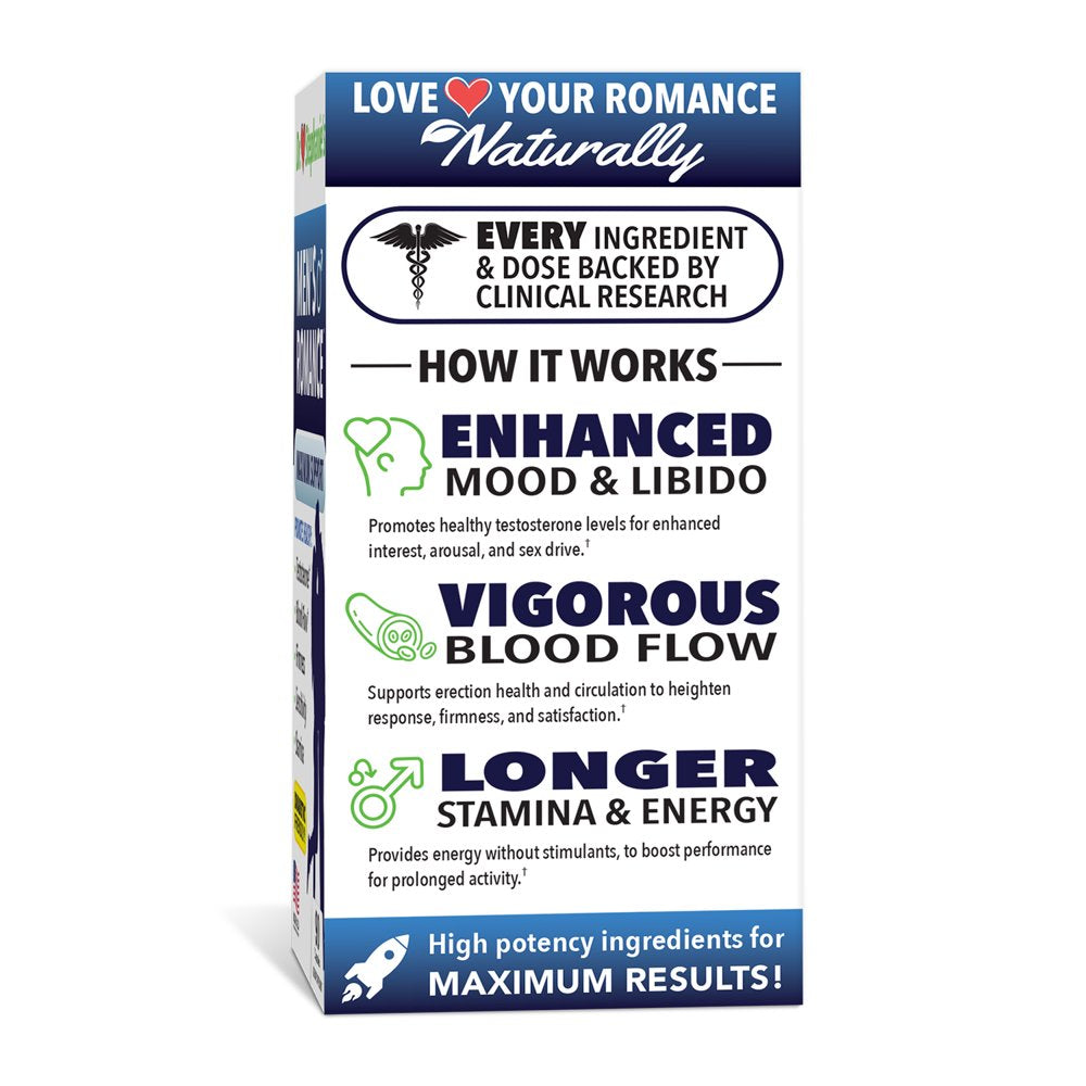 Men's Romance supplement provides maximum support for male Vitality. Promotes healthy testosterone, blood flow, firmness, sensitivity, and stamina. Use daily for long-lasting firmness, better performance and to maximize satisfaction. Provides energy without stimulants. Boosts stamina all day and night for prolonged activity. Loaded with clinically studied doses that actually work, with no useless fillers. 30 day supply per bottle. Formulated by doctors with only verified and clinically-tested ingredients.