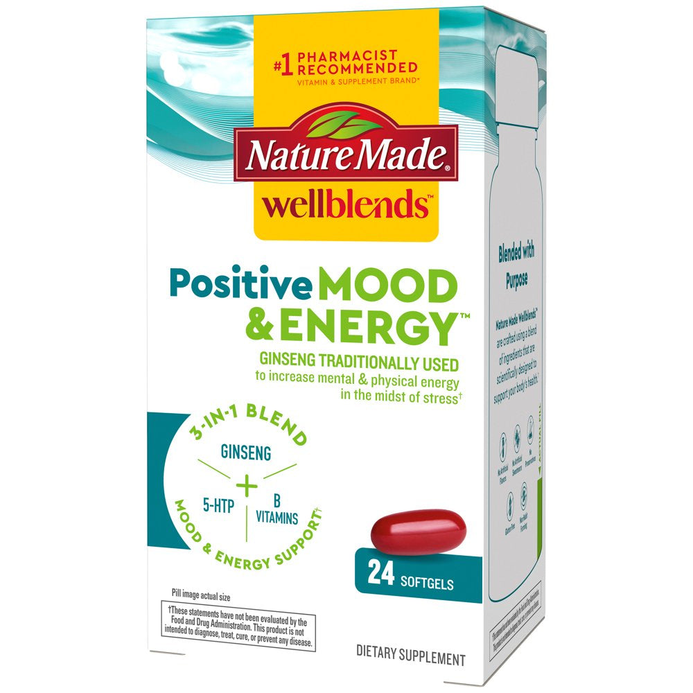 Nature Made Wellblends Positive Mood & Energy Softgels, 5HTP, B Vitamins, Vitamin B12, Ginseng, 24 Count