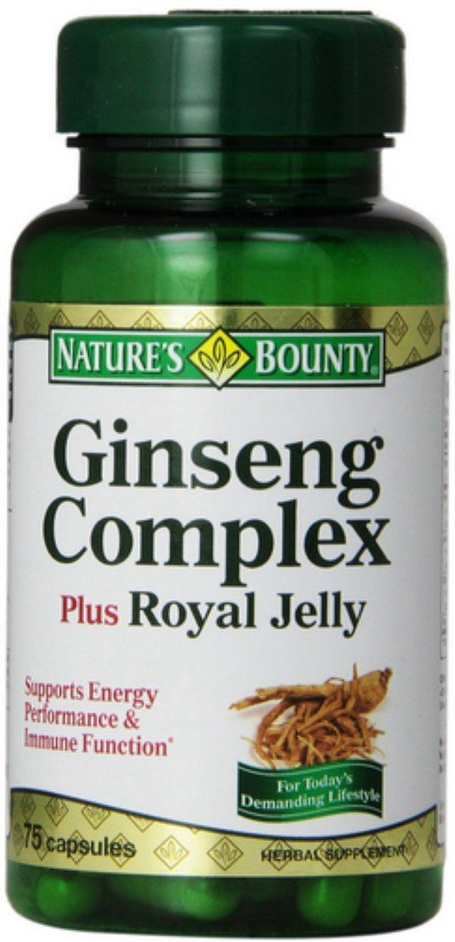 Nature's Bounty - Ginseng Complex Plus Royal Jelly - 75 Capsules Nature's Bounty Ginseng Complex Plus Royal Jelly blend of Panax, American and Chinese Red Ginseng forms a unique supplement designed to support physical performance and immune function while helping to release your natural energy. Ginseng contains naturally occurring ginsenosides and flavonoids. Plus Royal Jelly Supports Ener.