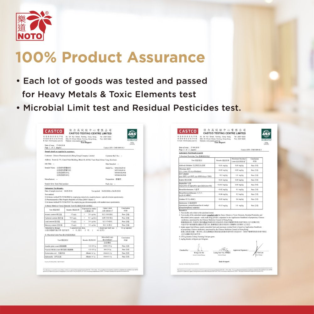 Each batch of Notoginseng Premium Vege Capsule has passed the quality monitoring and product safety testing by Inspection and Accreditation Agencies approved by the Hong Kong Government, which includes more than 10 tests.