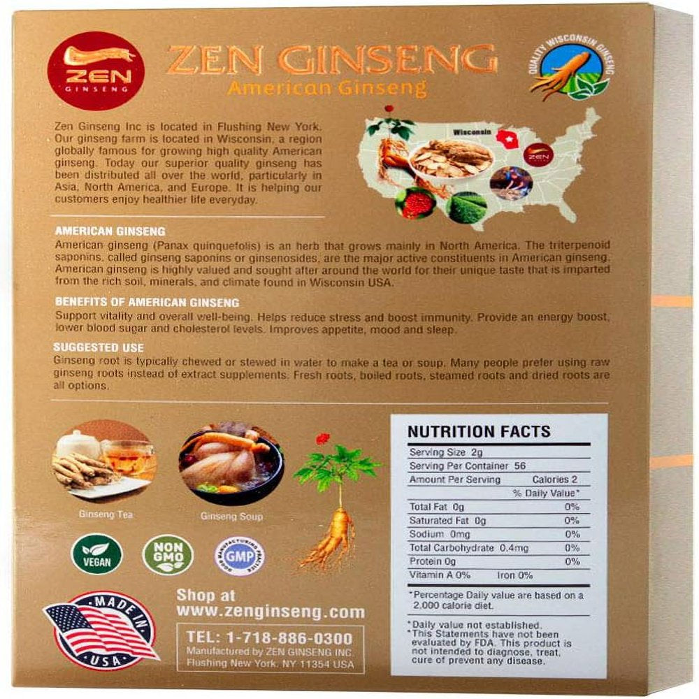 - HEALTH INGREDIENT: ZEN GINSENG???s hand selected American Wisconsin Ginseng is well know for its rich flavor, nature aromatic taste and traditional health benefits. Moreover, our high-quality ginseng is great for hot ginseng tea and cooking with delicious ginseng chicken soup. - ANTIOXIDANT BENEFIT: Our Wisconsin ginseng is a best rich source in antioxidants that can help you stay energetic and immunity! It's a super food for boost energy and stamina for men and women. American ginseng specifically helps to reduce fatigue associated with stress. As an adaptogen, this means that American ginseng can help bring energy levels back into balance, supporting healthy day time energy needs. American ginseng is a key ingredient in traditional Chinese medicine - NATURAL CULTIVATION: American Ginseng also known as Panax Quinquefolius is an herb that grows mainly in North America, our ginseng farm is located at centre of Wisconsin, it???s recognized as the ginseng capital of the world. Wisconsin ginseng is world-renowned for its excellence. Consumers all over the world specifically demand Wisconsin ginseng because they know it is the best. - HEALTHY DIET: The flavor of this ginseng root is bitter and earthy with a touch of sweetness. Add ginseng to food and cooking. American ginseng is also known as a good traditional health supplement for our body. It can lower blood sugar, cholesterol, carbohydrates and sugar. - 100% SATISFACTION: ZEN GINSENG???s Hand-selected American Ginseng is amazing and we know you'll love it. We want you to be fully satisfied! That???s why we back every order with our 100% Satisfaction so you can shop with confidence. If you are not satisfied with our product, you are protected by our no questions asked, money-back .