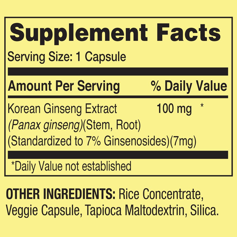 Spring Valley Korean Panax Ginseng Vegetarian Capsules is a dietary supplement designed for general wellness. Ginseng extract is a source of bioactive compounds that improve general wellness as a part of your healthy diet.* Suggested adult dosage is simply two capsules per day, preferably with meals. These vegetarian capsules are free of gluten, yeast, wheat, milk or milk derivatives, lactose, soy, and sugar and they contain no artificial preservatives, colors, flavors, fragrance, benzoates, coal tar dyes, MSG, phthalate, or non-intent BPA. You can rest assured that Spring Valley Korean Panax Ginseng Vegetarian Capsules is produced with strict quality guidelines and is backed by our quality guarantee.