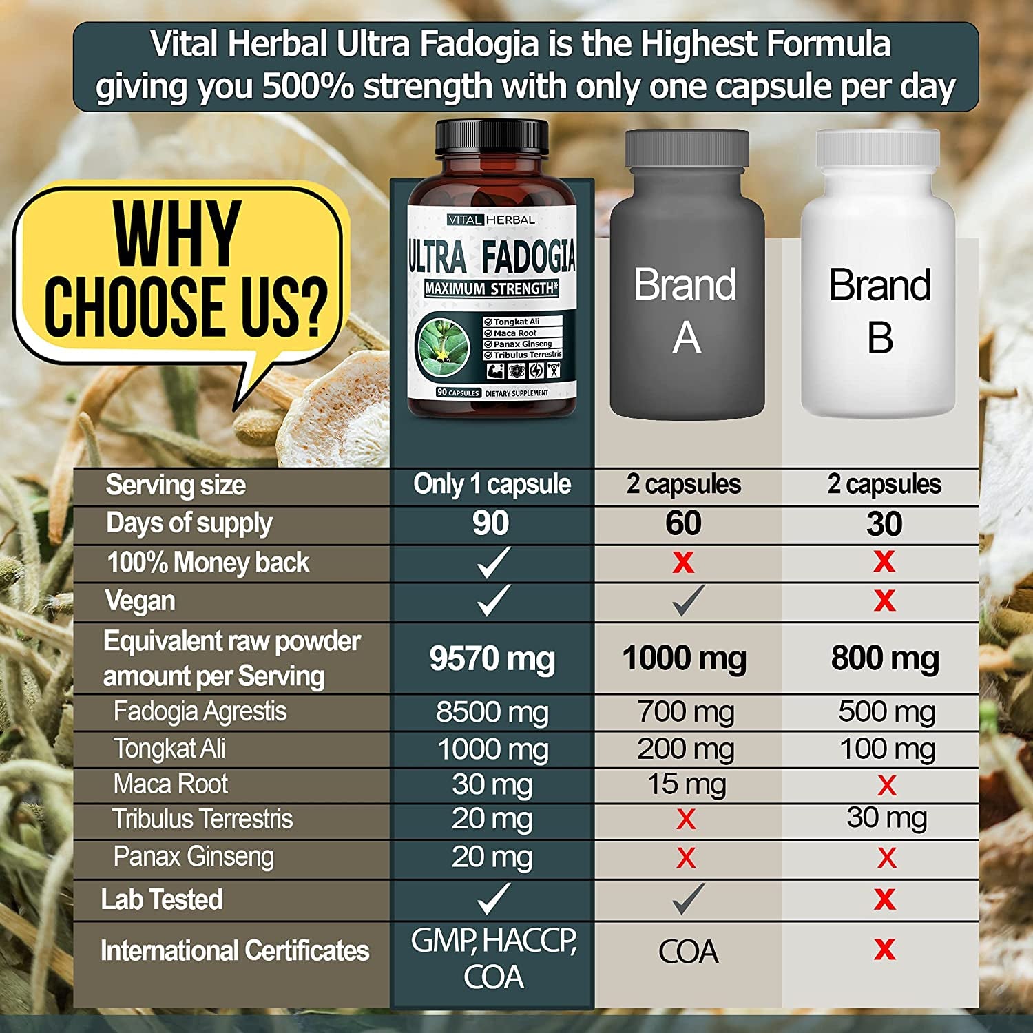- MAXIMUM POTENCY: Vital Herbal Ultra Fadogia Agrestis offers the highest concentration extracts available with a 10:1 extract of Fadogia Agrestis combined with Tongkat Ali 10:1 extract. This powerful formula enhances your energy, promotes male vitality, and strengthens your immune system.