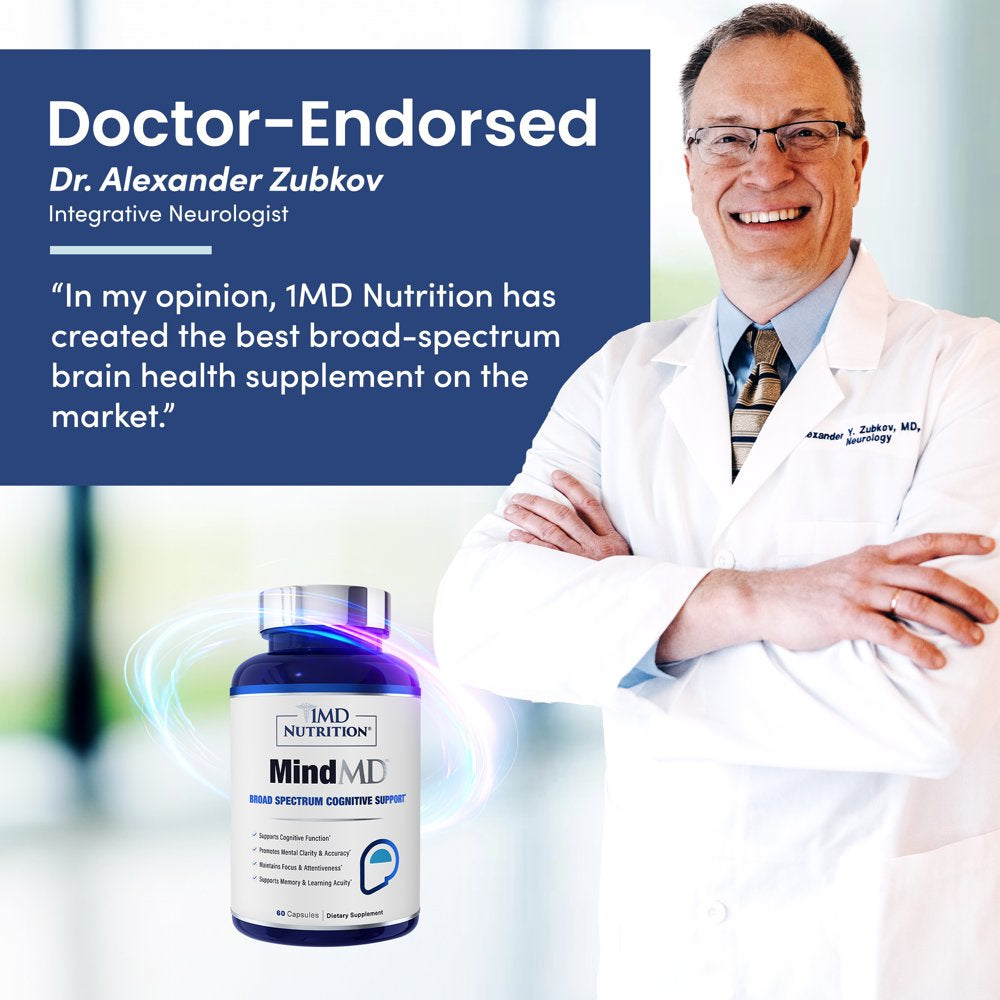 MindMD™ is scientifically formulated for broad-spectrum daily cognitive support.* This innovative brain health supplement combines the proprietary adaptogenic support of Bacognize® Bacopa monnieri extract, a full spectrum, clean label extract standardized to promote healthy cognitive function and acuity and foster focus and learning with COGNIGRAPE® standardized red grape juice powder extract containing high concentrations of the bioactive flavonoids anthocyanin and proanthocyanidin, to support immediate and delayed memory function and attention.* The addition of neurosupportive phosphatidylserine and vitamin B6 and antioxidants folate and green tea leaf extract offers a targeted health approach with comprehensive ingredients to support whole-brain wellness, including concentration, accuracy, learning, memory, energy, and more.* ● Broad-Spectrum Cognitive Support: 1MD Nutrition’s MindMD™ formula contains scientifically studied ingredients to help promote healthy short and long-term memory, learning, focus, and attention span and maintain healthy cognitive function.* ● 6 Comprehensive Ingredients: This scientifically formulated brain health solution is an innovative blend of the adaptogenic support of Bacognize®Bacopa monnieri extract,COGNIGRAPE® red grape extract, phosphatidylserine, vitamin B6 and antioxidants folate, and green tea leaf extract.* ● Supports Memory, Focus, and Mood: This brain-healthy blend helps maintain healthy homocysteine levels and neurotransmitter function in the synapses, reduces common oxidative stress in the brain, and promotes healthy neurological nerve function.* ● Maintains Mental Clarity and Accuracy: The collective action of the ingredients contained inside the MindMDTM formula supports a healthy mood, reinforces a sense of calm and clarity, and contributes to an overall feeling of well-being.* ● Supports The Growth of New Brain Cells: Each vegetarian capsule is specially made to support everyday neurogenesis, the growth of new brain cells. This can help you learn new information while supporting whole-brain wellness, including concentration, accuracy, and more.*
