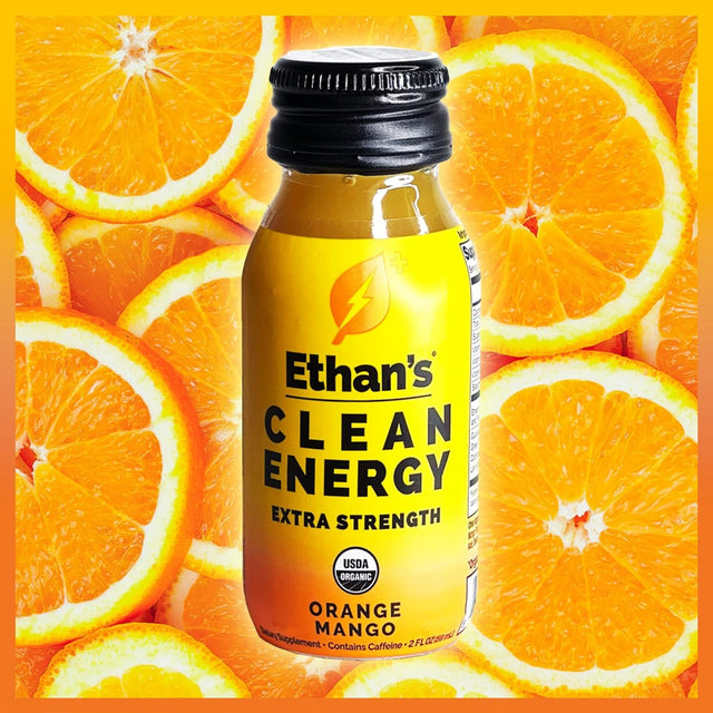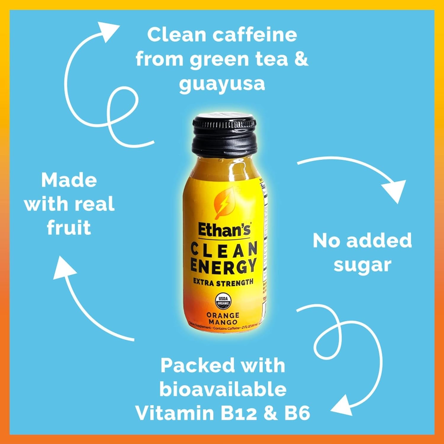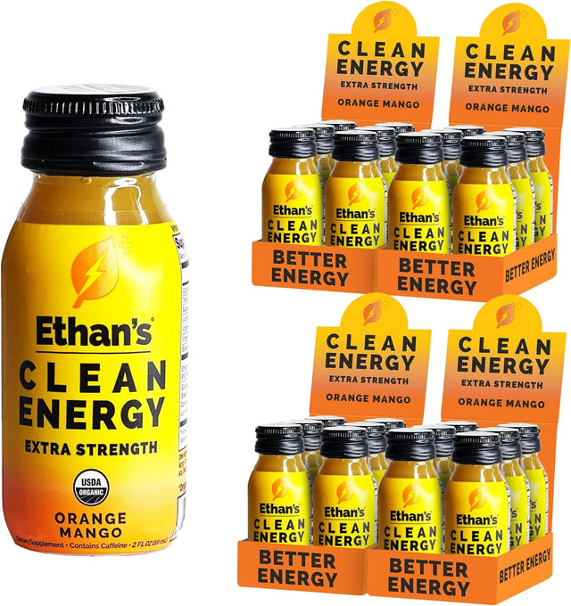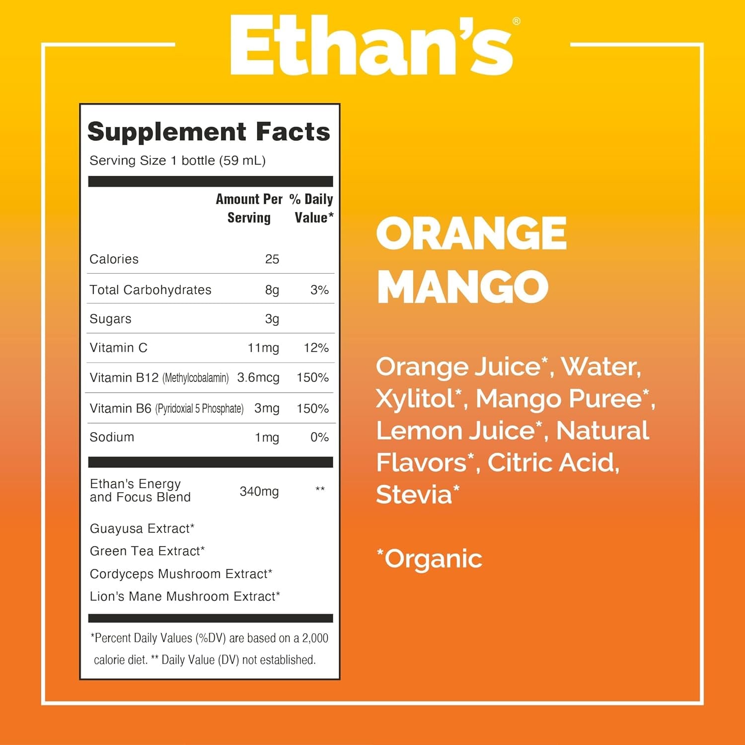 Ethan'S Organic Clean Energy Shots Orange Mango, Sugar Free Natural Pre-Workout Focus Boost, Gluten Free, Vegan, B6 & B12 Vitamin C with Green Tea Extract and Guayusa (24 Pack of 2Oz Shots)