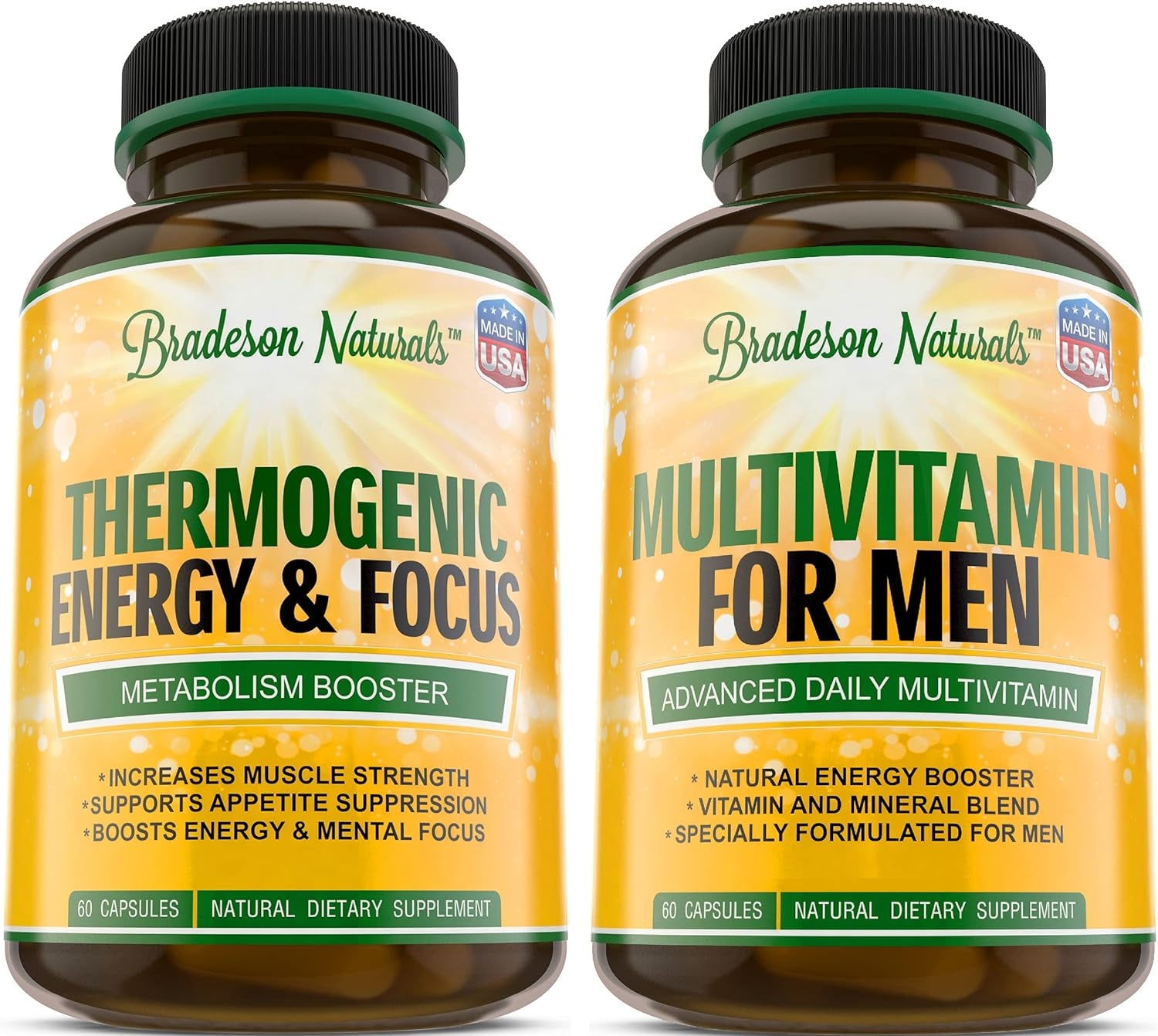 Men'S Multivitamin + Thermogenic Energy & Focus, 2 Bottles Bundle. Improves Cardiovascular & Prostate Health. Antioxidant & Natural Energizer + 2 Months Supply Thermogenic with Green Tea Extract Raspb