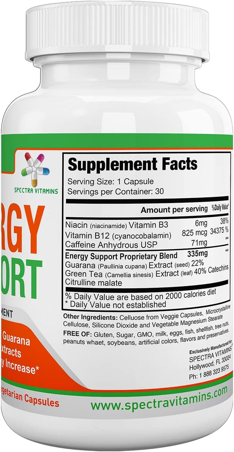 A BRAND YOU CAN RELYSpectra Vitamins has been considered as the best with high potency formulas that are specifically designed to fulfill daily essential needs. Spectra Vitamins provides a wide range of nutrients and extracts in forms that your body can use more efficiently. Dr. Neil Ross the formulator. has over 35 years of experience. We use high quality raw materials, formulas based on science and experience. | How to UseThe ENERGY SUPPORT capsule should be taken in the morning after the breakfast. The effect of active ingredients will “kick in” about 45-60 mins. The product was formulated that the person take capsule, would not have jitteriness and nervousness, but it will be smooth transition from lack of energy to feel energetic. The Energy Support effect should last 5-6 hours. | NATURAL HERBSSpectra Vitamins have changed the common perception of what a energy boost capsule should be by using all natural, safe and effective ingredients. Each capsule contains natural herb like Guarana and Green Tea Extracts and Citrulline which accelerates your energy. It helps you to feel energetic 5-6 hours a day. |