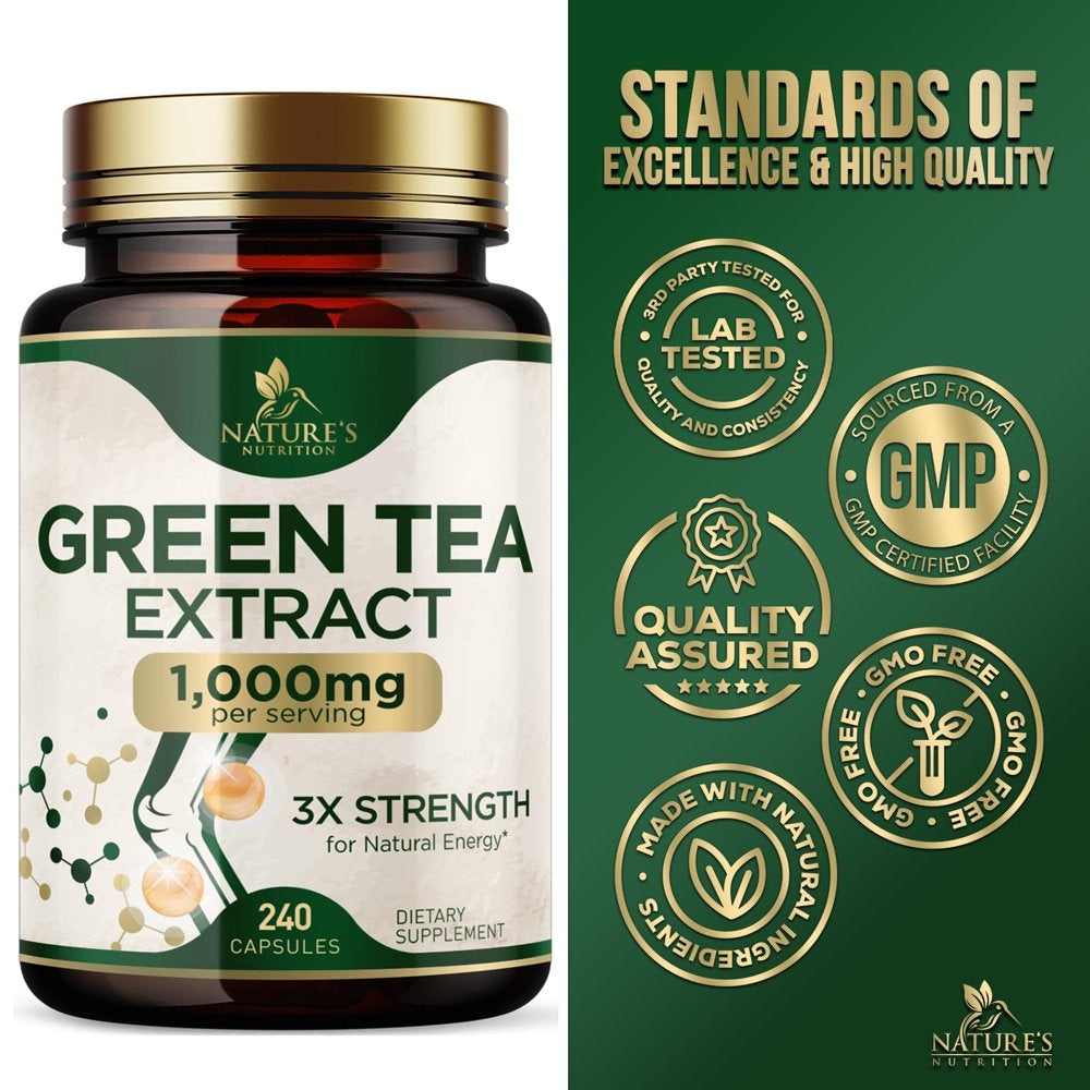 Nature'S Green Tea Extract Pills 98% Standardized EGCG 1000Mg - 3X Strength for Natural Energy & Supports Heart Antioxidant Health - Herbal Supplement with Polyphenols, Vegan, Non-Gmo - 240 Capsules