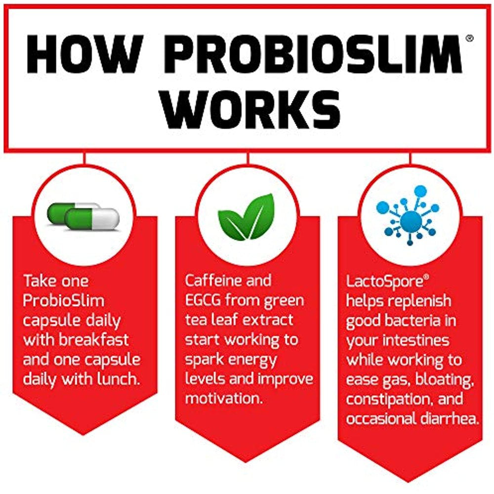 A UNIQUE TWIST ON PROBIOTICSProbioSlim’s premium formula combines one of the most efficacious and resilient probiotic strains with natural energy-boosting ingredients to deliver relief from the digestive discomforts that can slow you down throughout the day.The innovative compound LactoSpore helps ease symptoms associated with occasional diarrhea, constipation, gas, and bloating. At the same time, it promotes the growth of beneficial flora, helping to reduce the proliferation of harmful bacteria. LactoSpore is scientifically engineered to survive the harsh environment of your gastrointestinal system to provide maximum digestive benefit.Keeping up with the pace of your daily routine when you’re bogged down by digestive distress is a challenge. To help you stay motivated, the powerful green tea leaf complex in this formula combines with caffeine to deliver a clear boost of energy.Take control of your digestion and your motivation with ProbioSlim, and fully Unleash Your Potential!