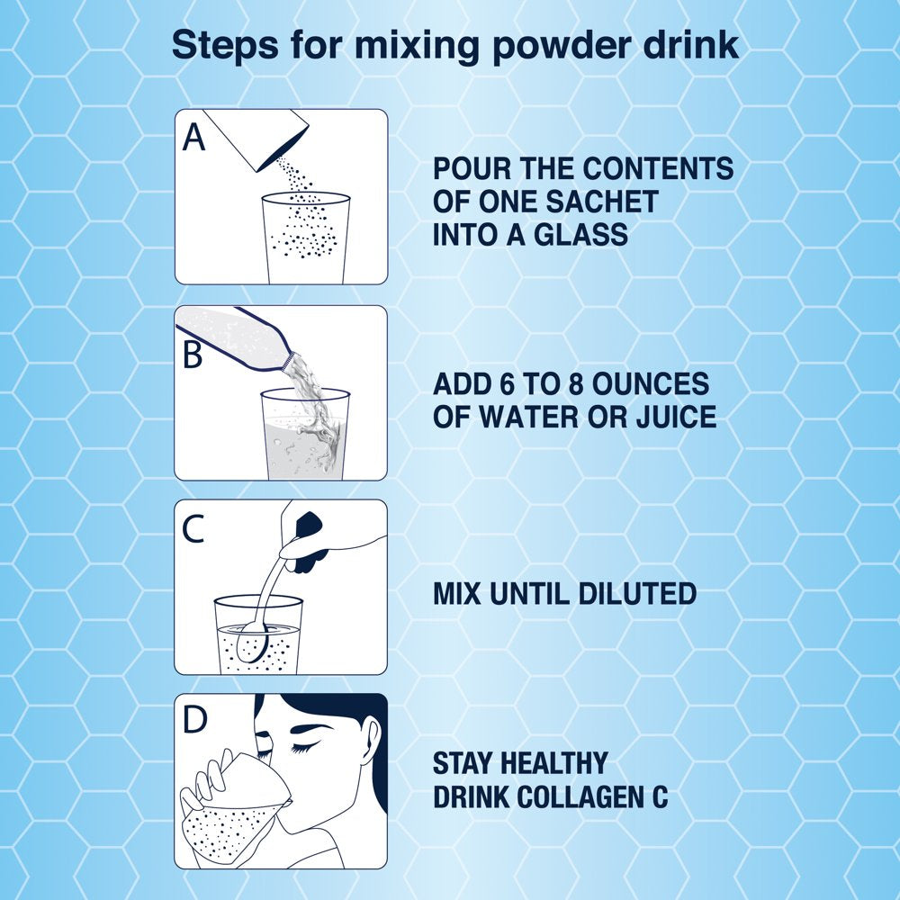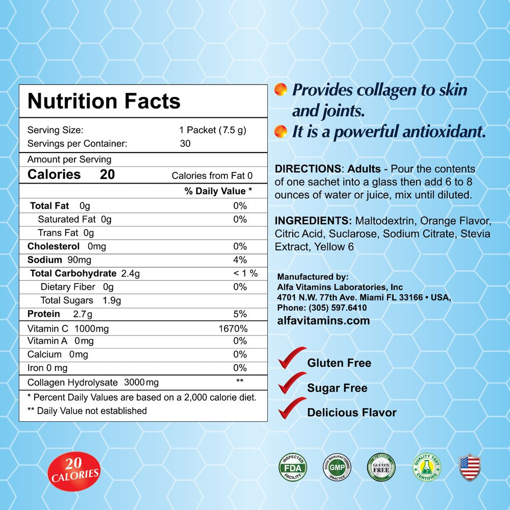 Protein supplement of collagen hydrolysate powder conveniently packaged in individual doses. Collagen is necessary for the health of the ligaments, joints, and bones, muscles, and skin. This protein is found in tissues that connect the organs. Quantity and quality are affected by aging, disease, and as a result of accidents. Each sachet contains 3000 mg of collagen and 1000 mg of Vitamin C, which in addition to improving the assimilation of collagen in the body is a powerful antioxidant, vital for normal cell growth and its repair.