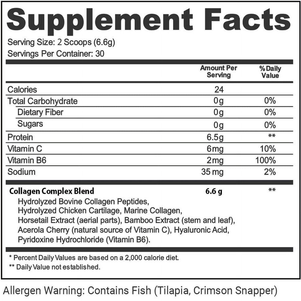 Hydrolyzed Bovine Collagen Peptides; Hydrolyzed Chicken Cartilage; Marine Collagen; Horsetail Extract (aerial parts); Bamboo Extract (stem and leaf); Acerola Cherry (natural source of Vitamin C); Hyaluronic Acid; Pyridoxine Hydrochloride (Vitamin B6)/div>