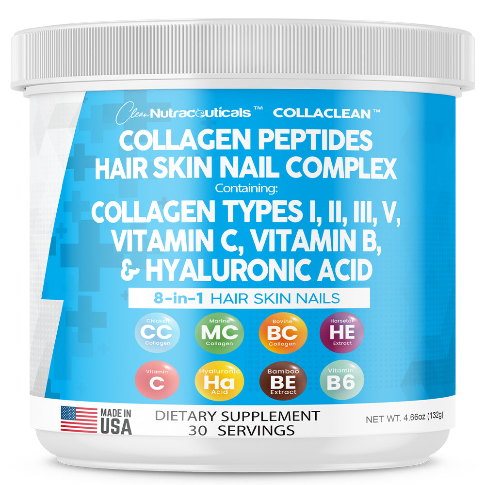 Collagen Peptides Powder Hair Skin Nail Complex with Collagen Types I II III V and Hyaluronic Acid Vitamin C and Vitamin B from Clean Nutra - 132G