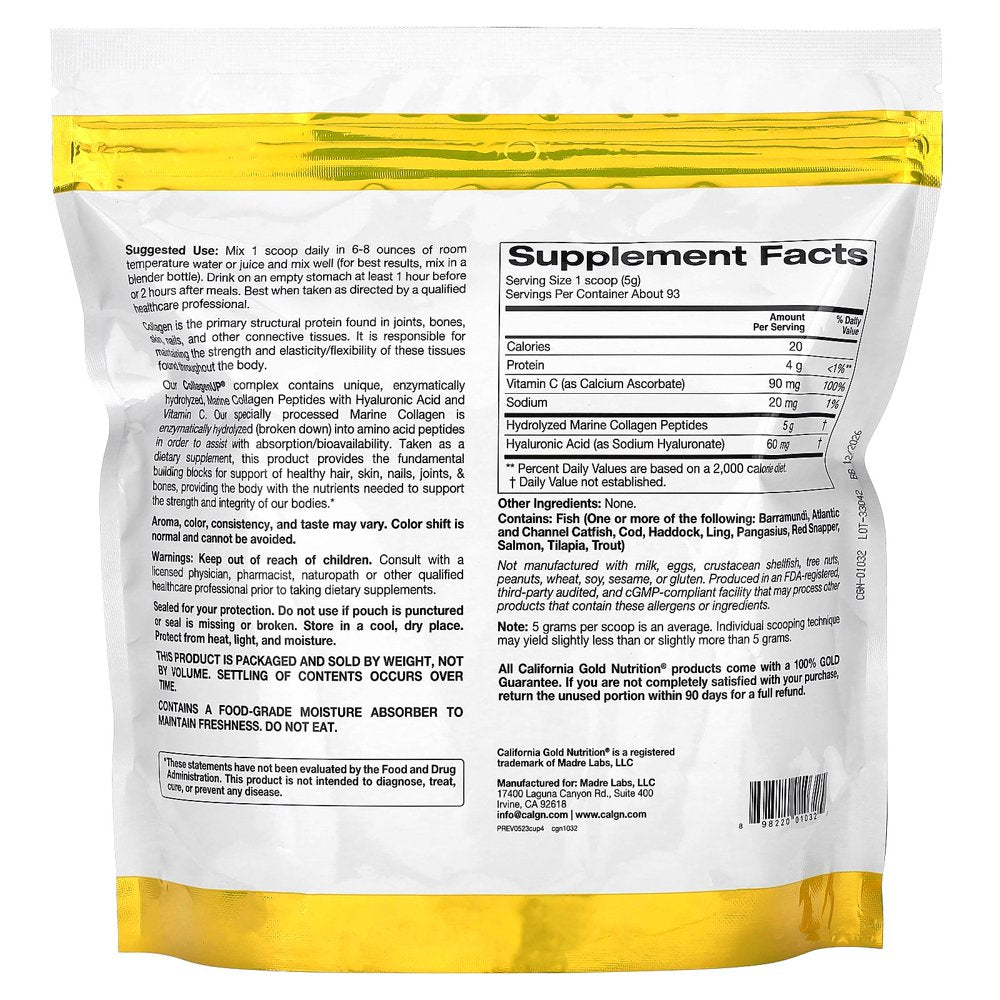 California Gold Nutrition® CollagenUP, 16.37 oz (464 g) contains ingredients to help support healthy hair, skin, nails, joints, and bones.* The unflavored powder can be quickly added to your favorite drink, providing a convenient way to add collagen to your diet. Marine Sourced Collagen Peptides + Hyaluronic Acid + Vitamin C Featuring Unflavored, Non-Bovine, Hydrolyzed Fish Collagen With Non-Animal Source Hyaluronic Acid and Vitamin C Support for Healthy Hair, Skin, Nails, Joints and Bones* Enzymatically Hydrolyzed Collagen Broken Down into Bioavailable Peptides iTested Verified