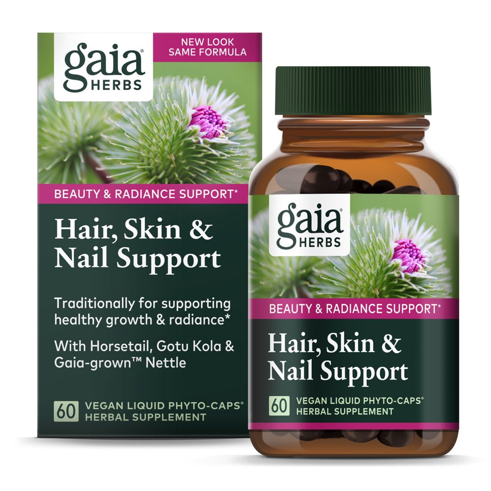 - Gaia Herbs Hair, Skin & Nail Support, Helps Promote Healthy Skin, Hair Growth and Nail Growth, with Horsetail, Alfalfa, Burdock, Gotu Kola, and Nettle, 60 Vegan Liquid Phyto-Caps (15-Day Supply)