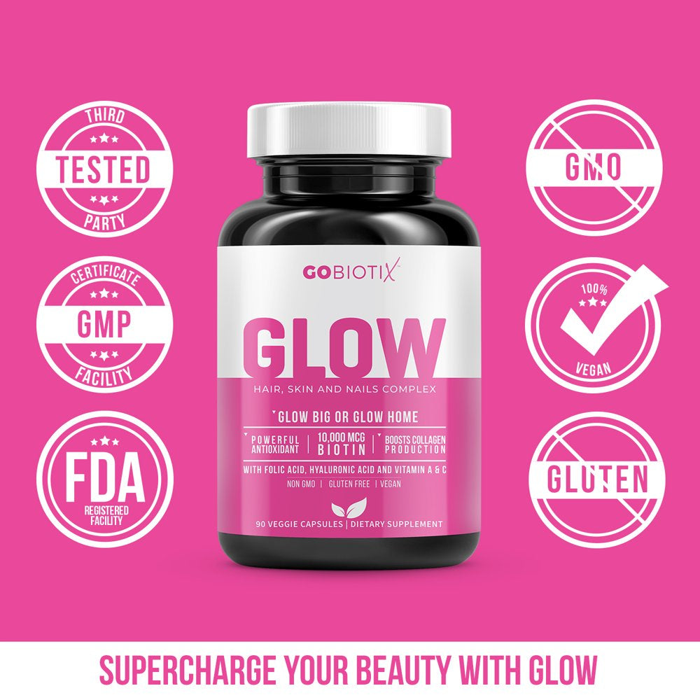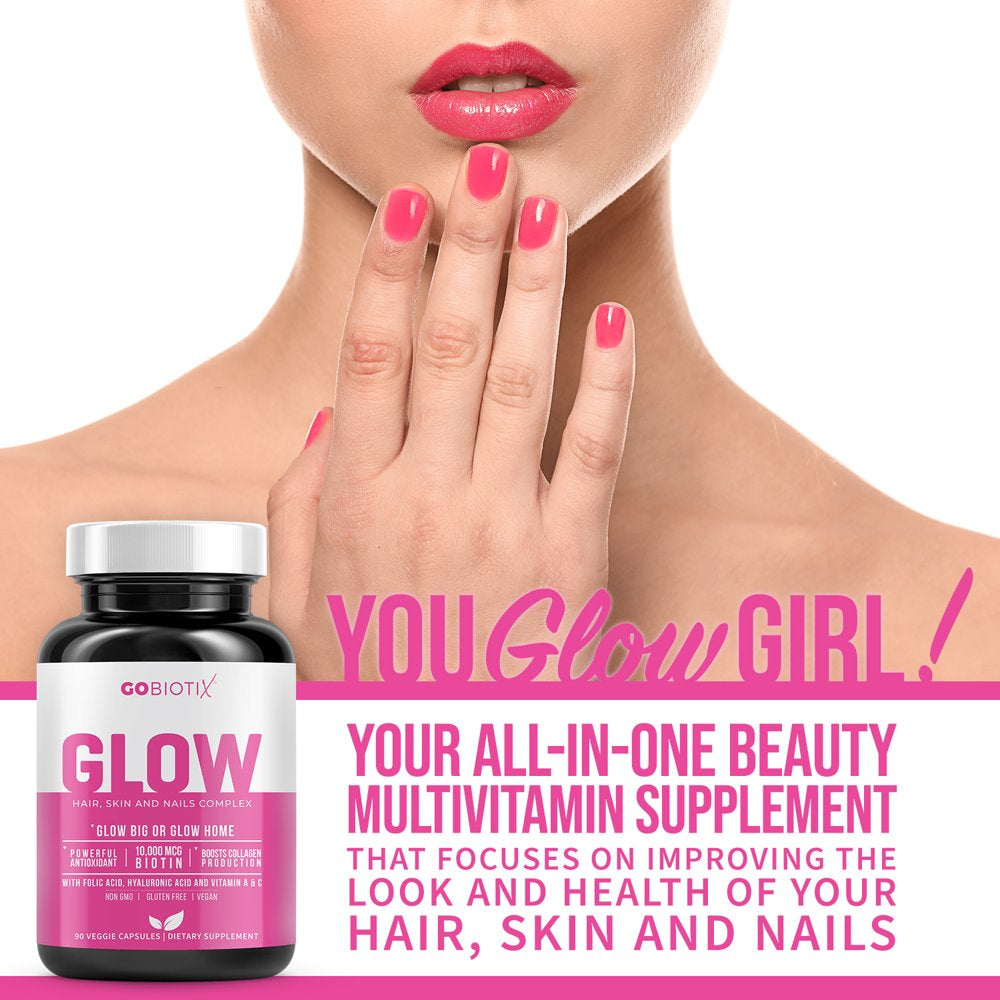 THE ALL-IN-ONE BEAUTY MULTIVITAMIN GoBiotix Glow Beauty Multivitamin is specifically formulated to help hydrate and firm sagging skin, strengthen brittle nails, and encourage fuller hair growth. Loaded with essential Vitamin B and D, along with essential nutrients and minerals like Biotin, Hyaluronic Acid, and Zinc, GoBiotix Glow Beauty Multivitamin allows your best self to shine through.